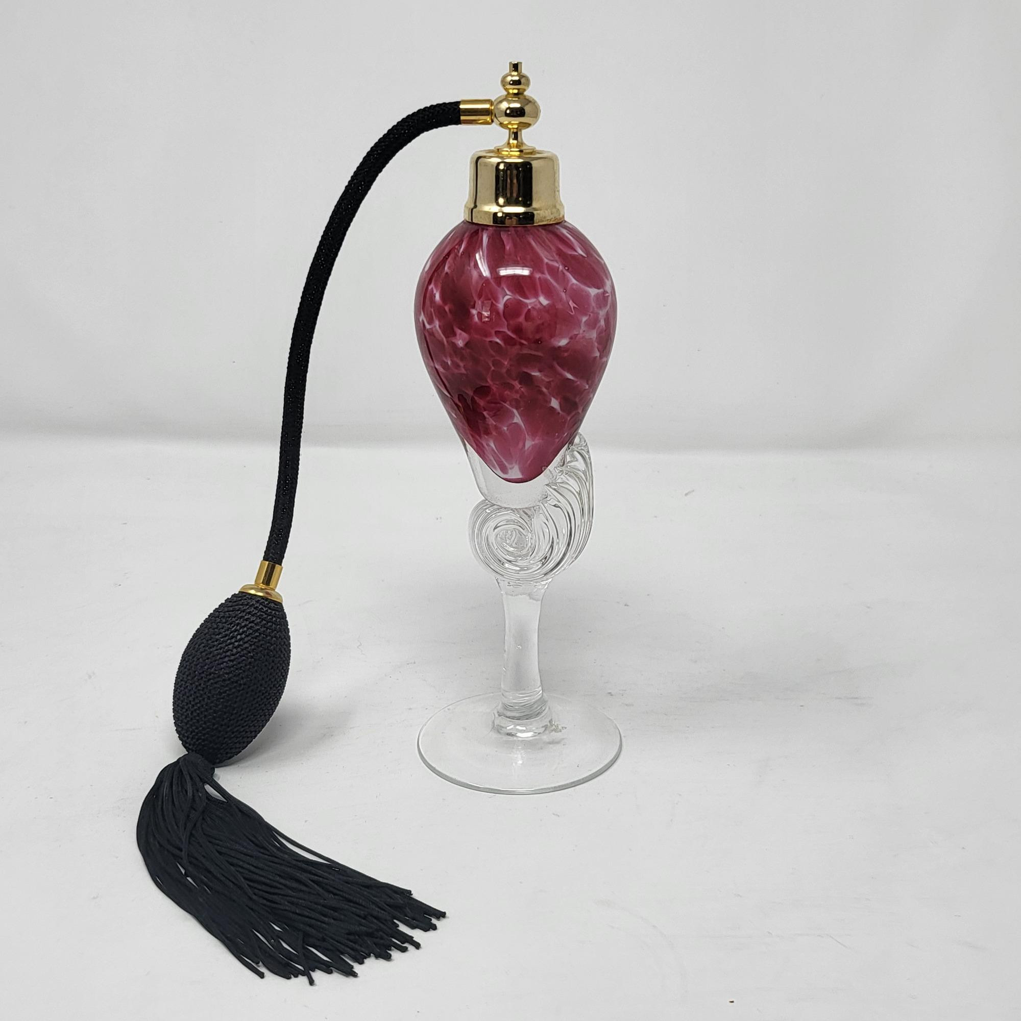 Excellent condition, spotted pink glass bottle and clear swirl glass stem, perfume bottle 8.25" T. Atomizer works perfect.