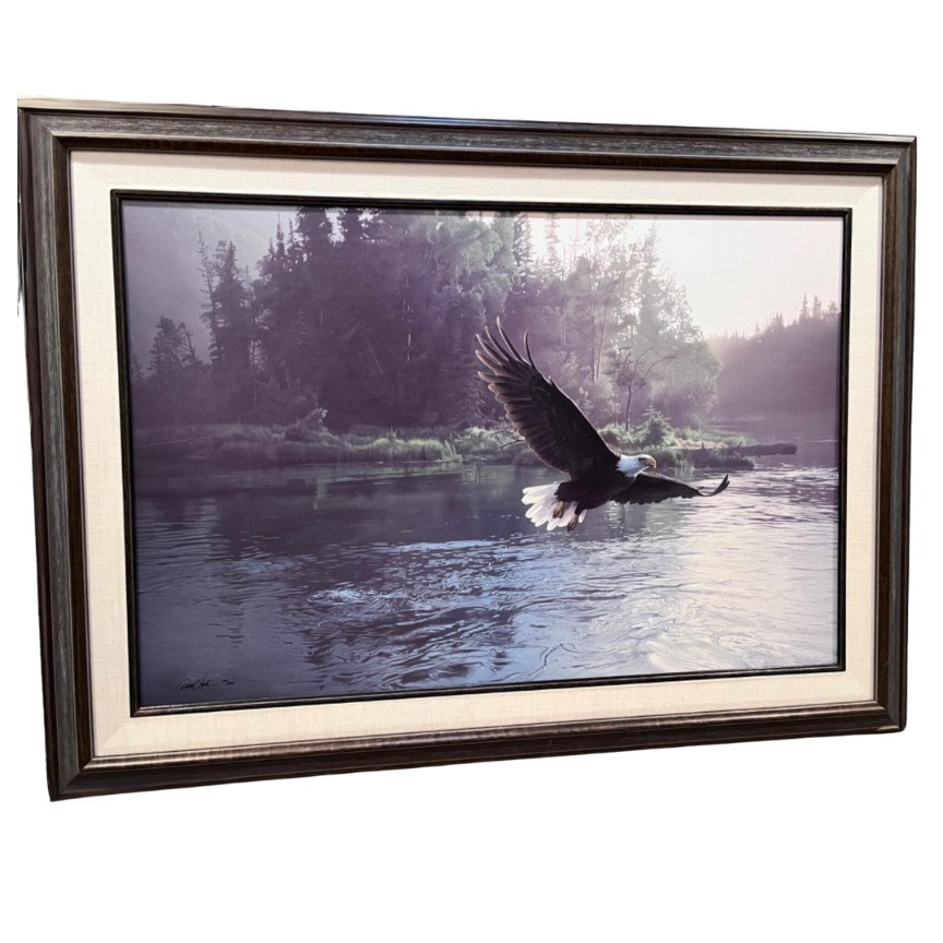 "Forever Free" is a lithograph reproduction from the artists original 1998 acrylic painting of a bald eagle flying freely over water. The printing is produced on gesso-coated artists' canvas. Daniel Smith released the production in 1998. Each lithograph is hand-signed by the artist and numbered and the original films from the production process have been destroyed. This issue is #417 of 2,500 produced and has a Certificate of Authenticity. Canvas size is 25" x 37". Framed: 33.5" x 45.25".