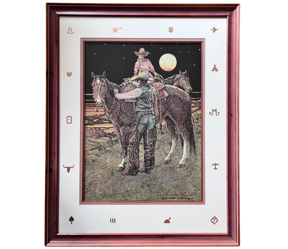 Buckeye Blake, artist. Double signature. #180 of 650 produced. Detailed print of cowboy and girl out for a horseback ride on a moonlit night. Framed in a unique finely finished knotty pine frame. Print is matted and under glass.