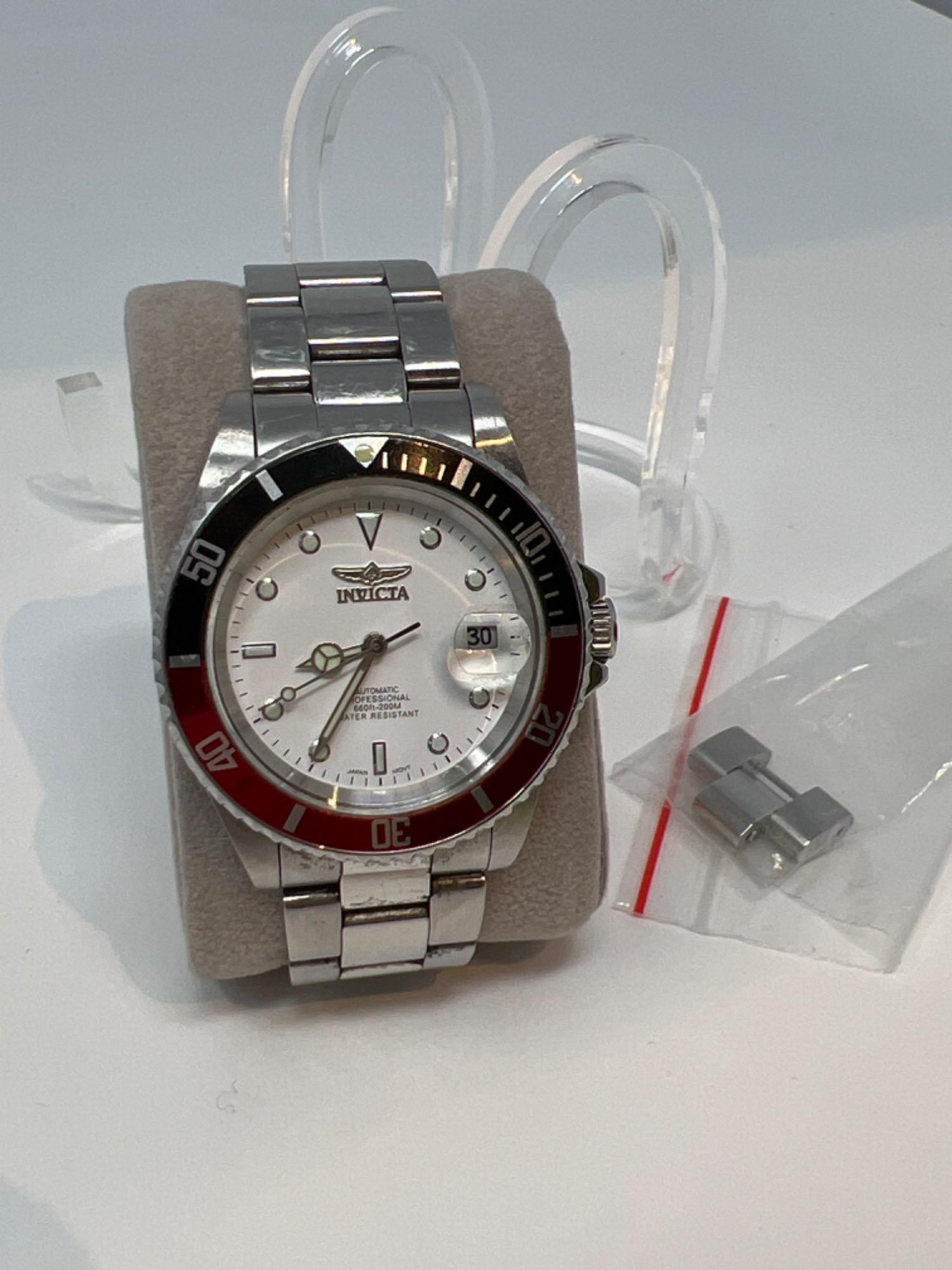 Invicta Automatic Pro Diver 200M Silver Tone Dial 9404 Men's Watch IN WORKING CONDITION. 21 Jewels. Great watch for daily life, business, or diving. Features:Stainless Steel Case, Stainless Steel Bracelet, Automatic Movement, Mineral Crystal, Silver Dial, Blue/Black and Red Ion-Plated Stainless Steel Bezel, Date Display, Screw Down Crown, Luminous Hands, 200M Water Resistance, Fold Over Clasp, Approximate Case Diameter: 40mm; Approximate Case Thickness: 14mm. Has extra link to extend size of band. Used with some sign of wear but overall like new.