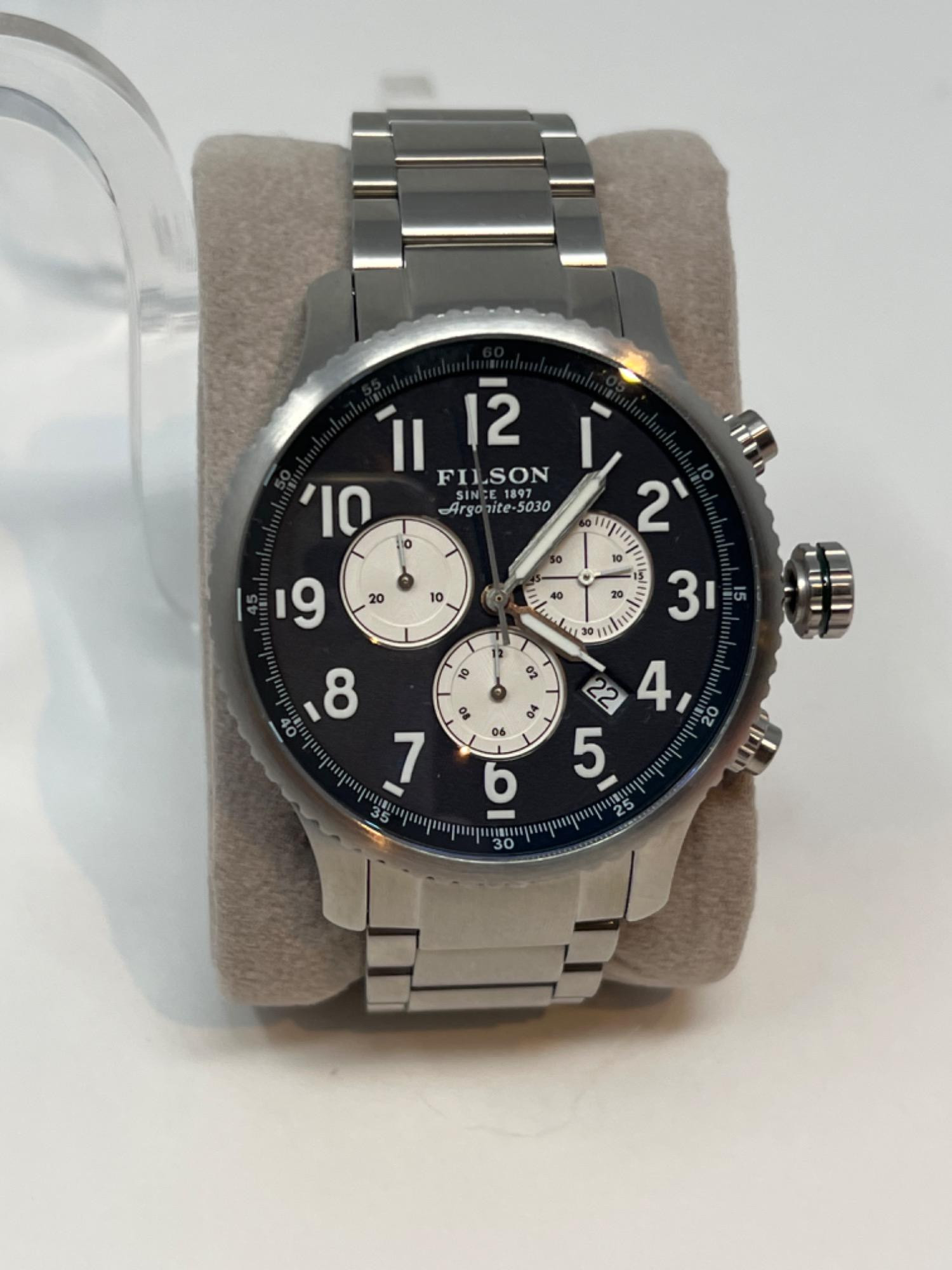 Rare Filson black face Argonite-5030 #F0120001945 chronograph men's wristwatch. Water resistant, sapphire crystal, all stainless steel. Steel band currently on watch. Included is an unused genuine leather band including extra links to increase size of steel band. Lightly used. $1,000