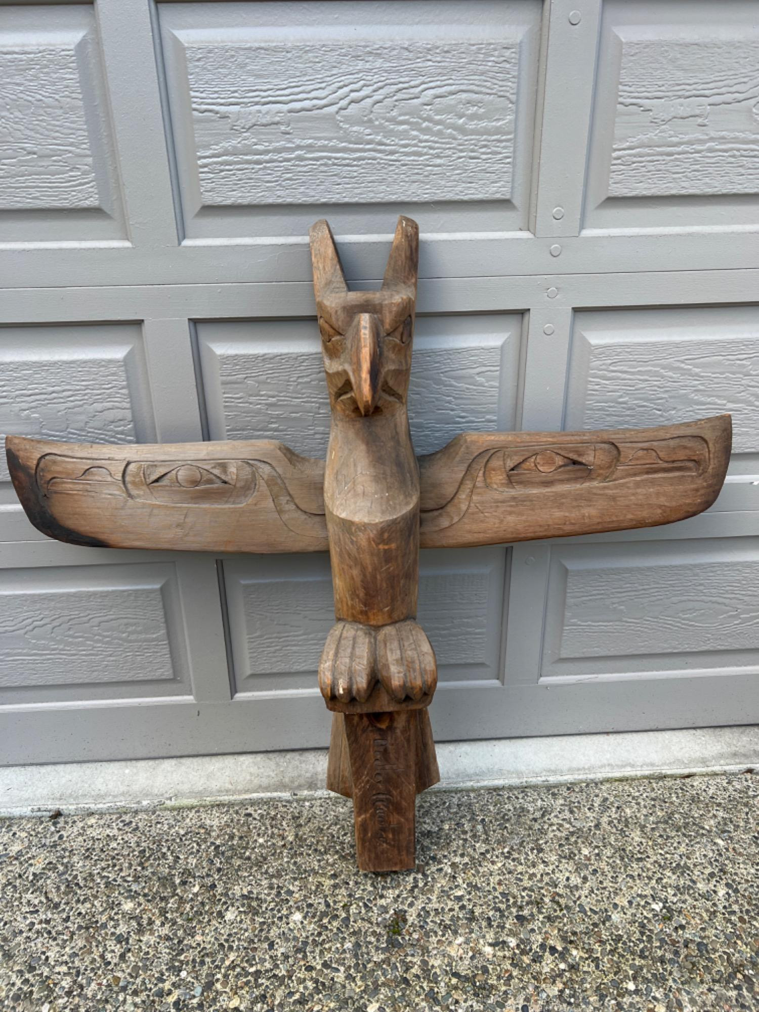 Dudley Carter (Redmond park named after him in 2012) was born in 1891 in British Columbia. He learned to carve from the Salish Native Americans. Dudley became a professional carver and sculptor and his works are throughout the world. This Eagle Totem is one of Dudley's works and is signed by the carver. It is roughly 3.5' feet tall (exact dimensions) 41” tall x 44” wide (wing span) x 10” depth. The carving is reflective of the Pacific Northwest Native American style.
