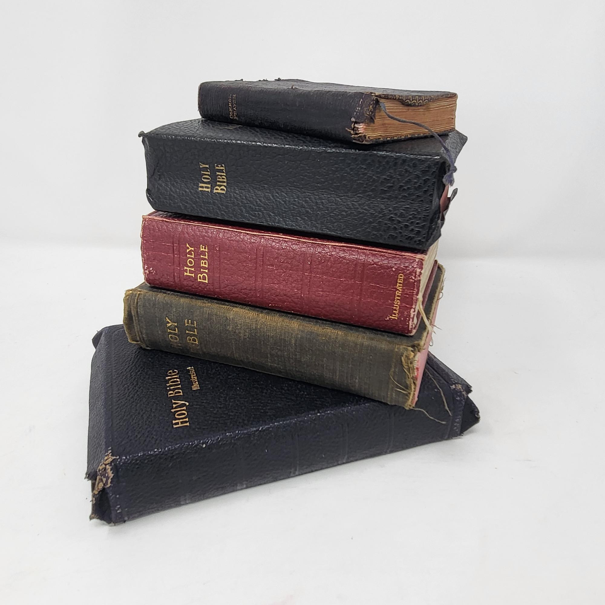 Five Holy Bibles. Ranging from 4.5" x 3" to 7" x 5". Various condition to binding and spines.