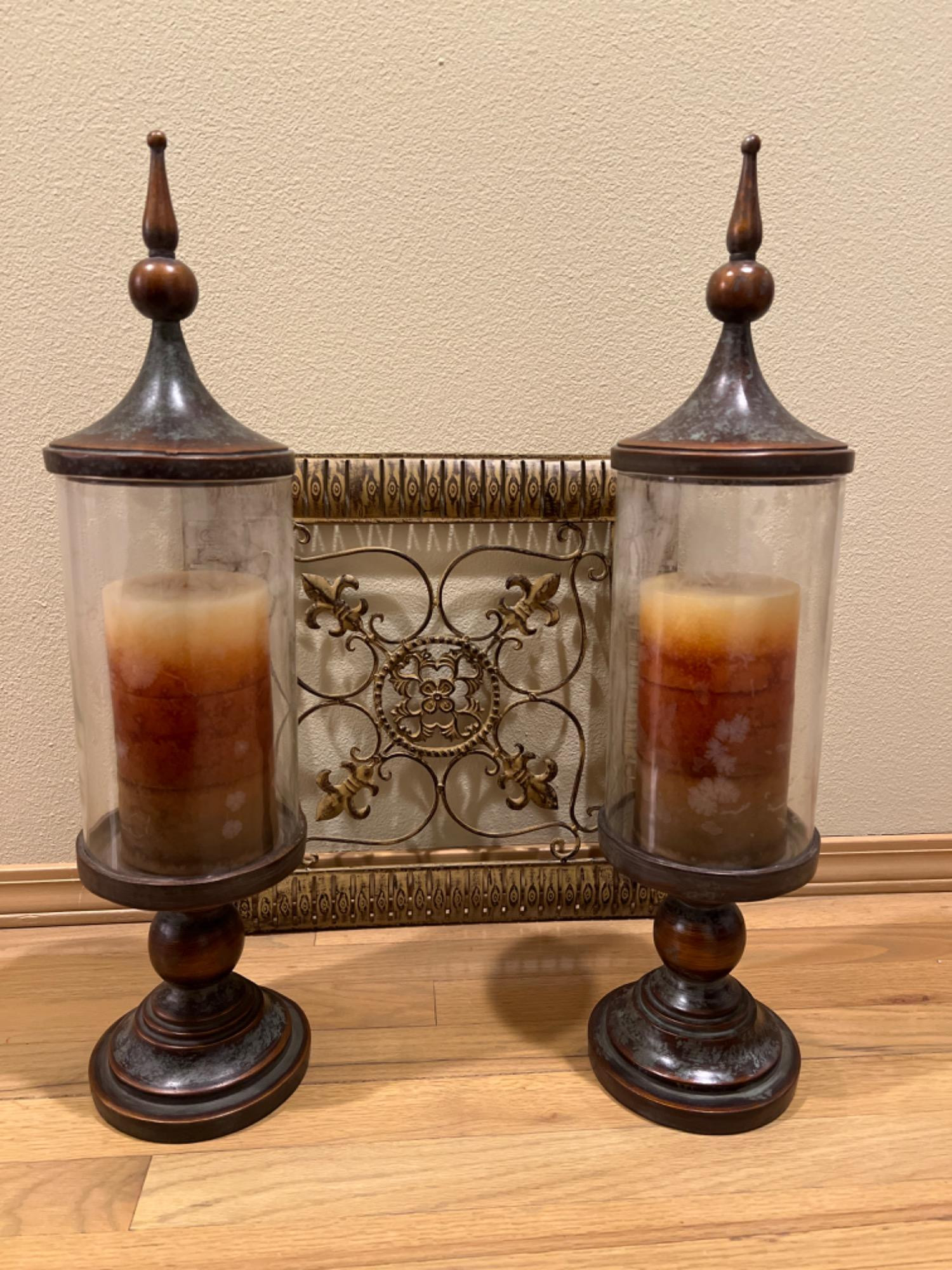25” tall overall 5.5” round votive 17” tall without lid 16.5” x 16.5” square metal art.