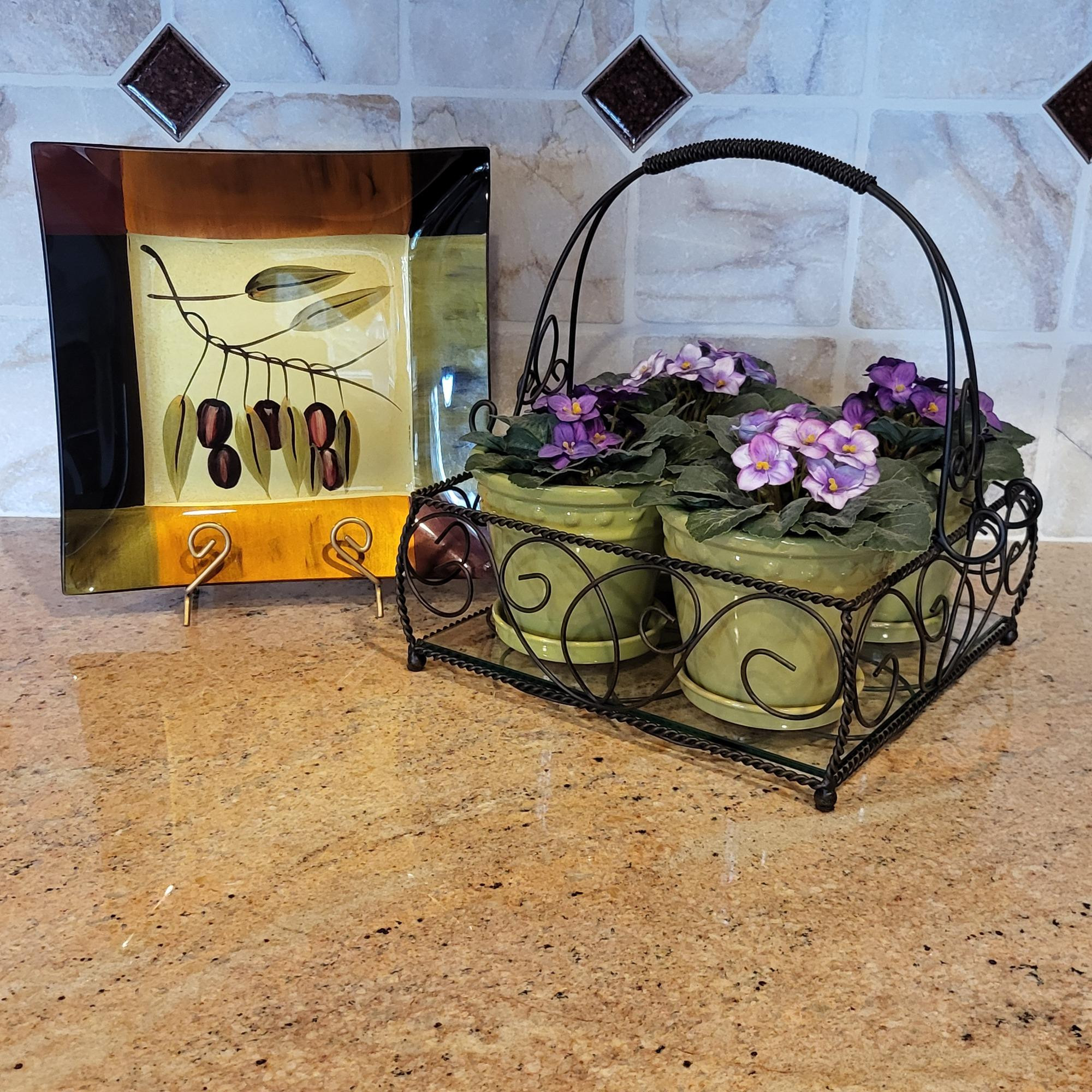 Tuscan 10" square glass plate with stand. Black metal basket is 11" x 12". Four artifitial flower in green ceramic pots 5" T x 4.5" Round