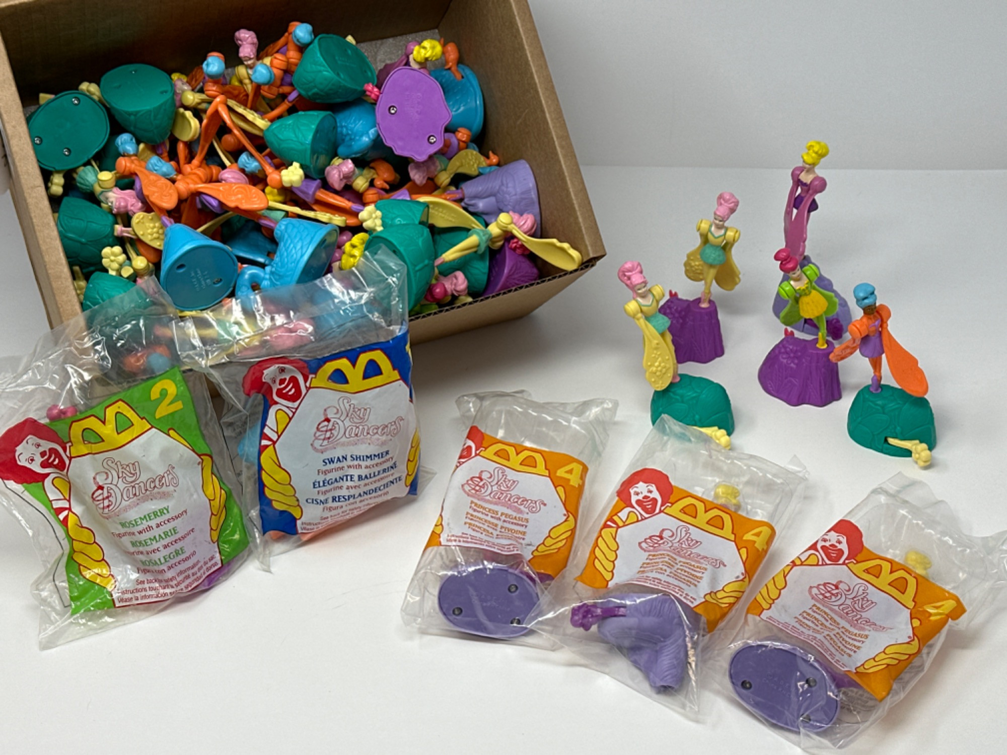 Box of Happy Meal Toys Some unopened packages. All Sky Dancers... bases, dancers, and some are assembled 4.5” H