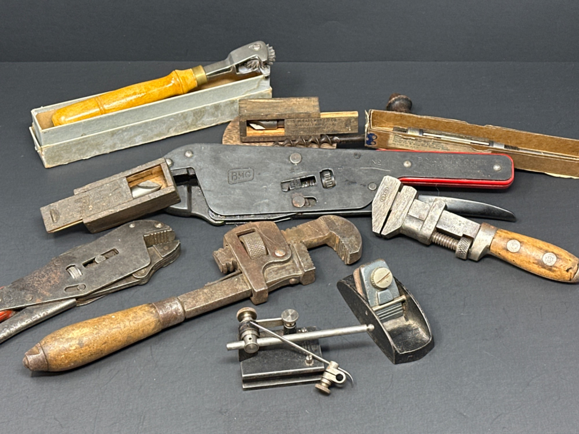 Awl 2 pipe wrenches Cresent wrenches Plane And other tools
