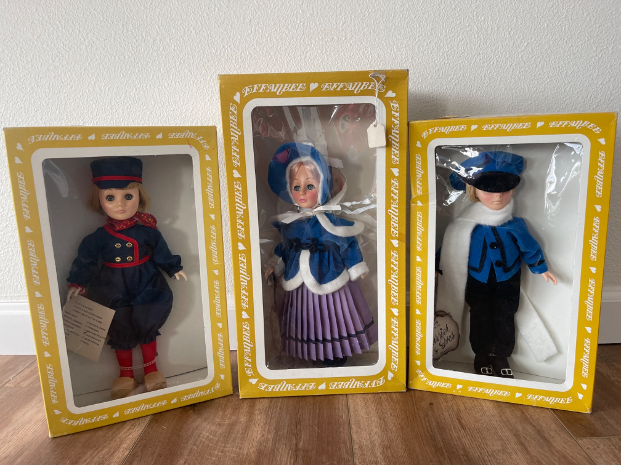 Vtg Effanbee Dolls - Currier And Ives Skater Pair & Hans Brinker Skater female - Right eye sticks slightly but still works. Appears to have been removed but unplayed with Both male dolls are in original attached positions - unused