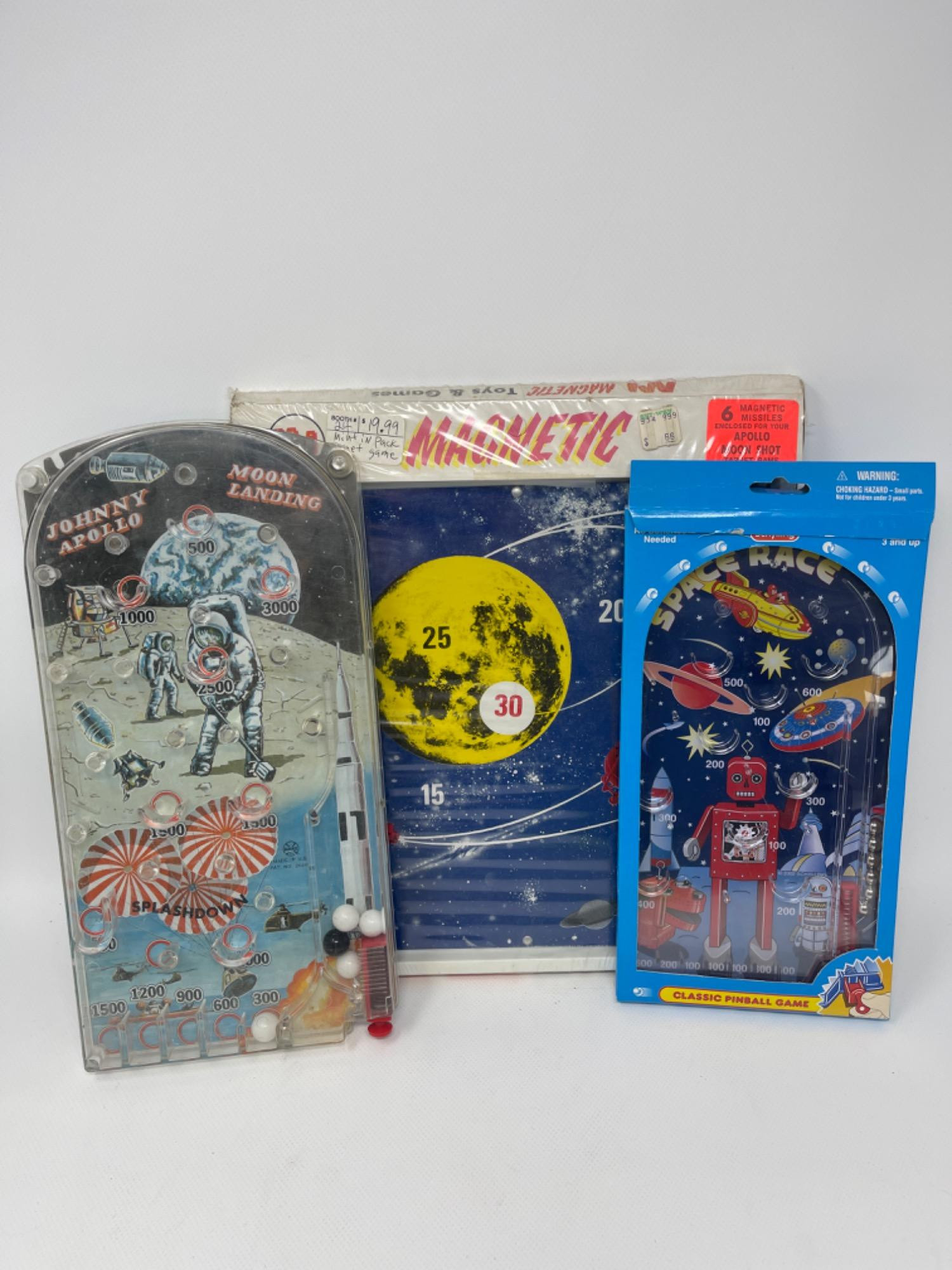 1960’s Johnny Apollo Moon Landing Pinball/Marble Game Marx Toys - Chip to top right corner 2002 Schylling Toys Space Race Pinball Robot Rocket Ship Game - outer box has tear SEALED Vintage Apollo Moon Shot Molenaar Inc Magnetic Game