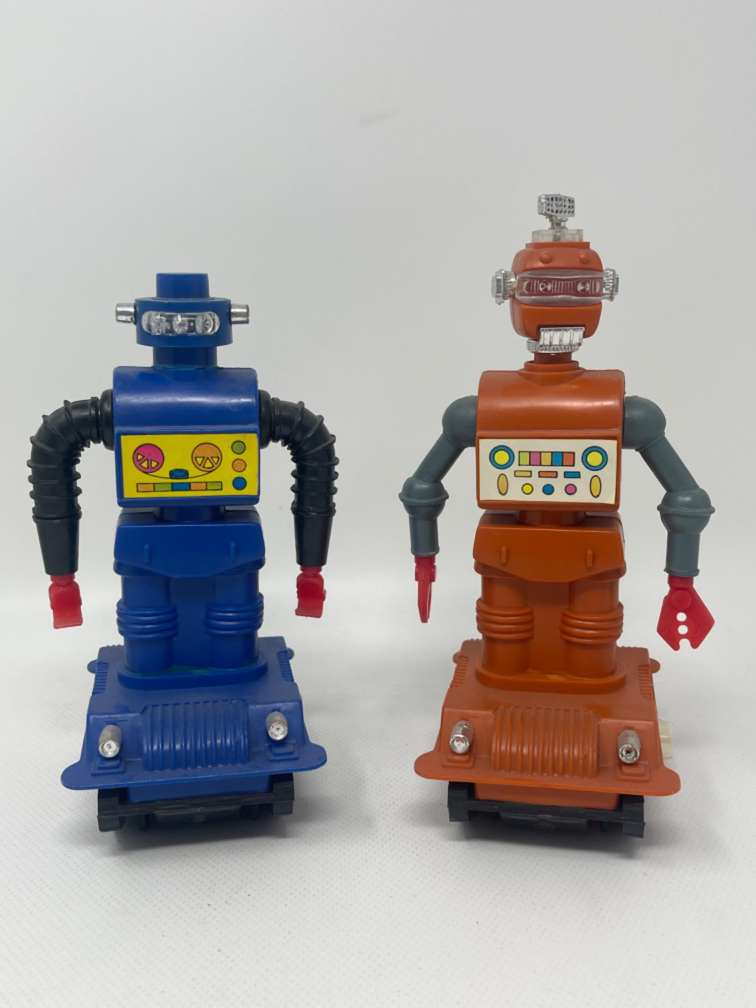(2) Vintage Durham Star Mission Wind-Up Robots Blue: 6.75 inches tall Orange: 7.5 inches tall