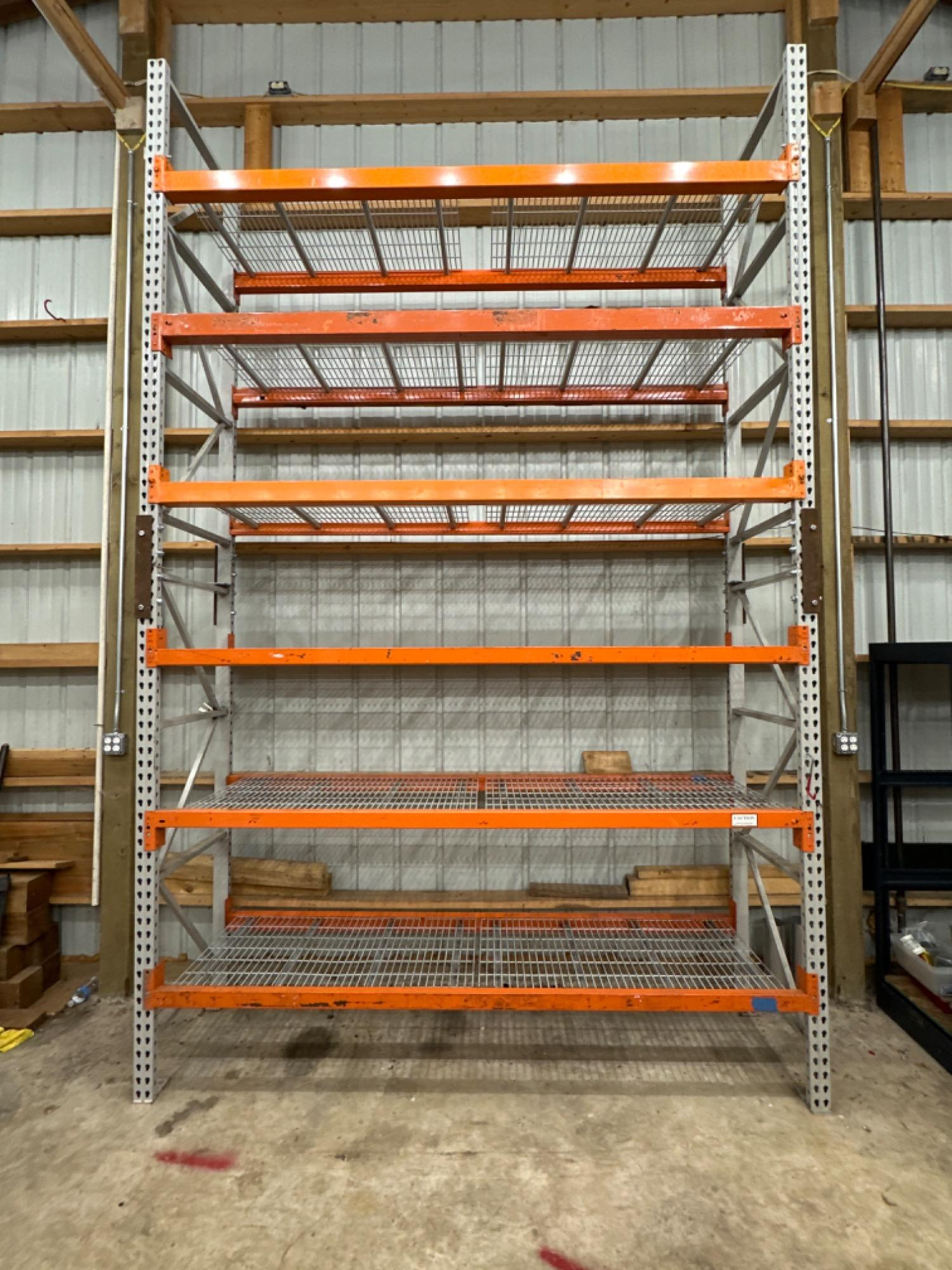 Large Steel Rack/Shelving 105 w x 82” H x 28” D (each unit) Two units are stacked (and bolted) on top of each other and bolted to the shop wall (as shown) *these units are able to be separated and used either as shown or separately **BUYER MUST BRING TOOLS TO DISMANTLE**