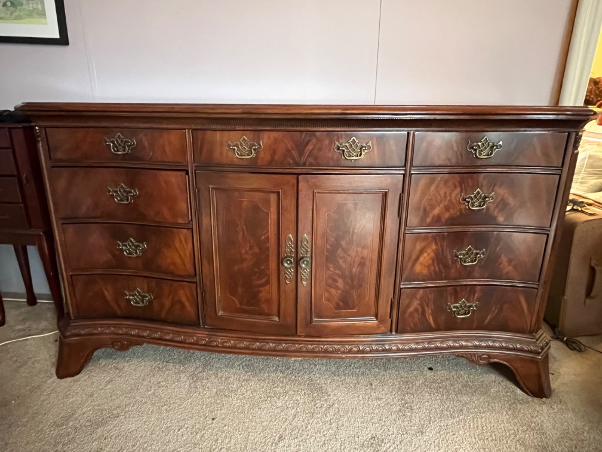 Measures 38” h x 69” w x 20” d. Mirror is 51” h x 39” w. Dresser is very heavy. Solid wood. Bring help to move.