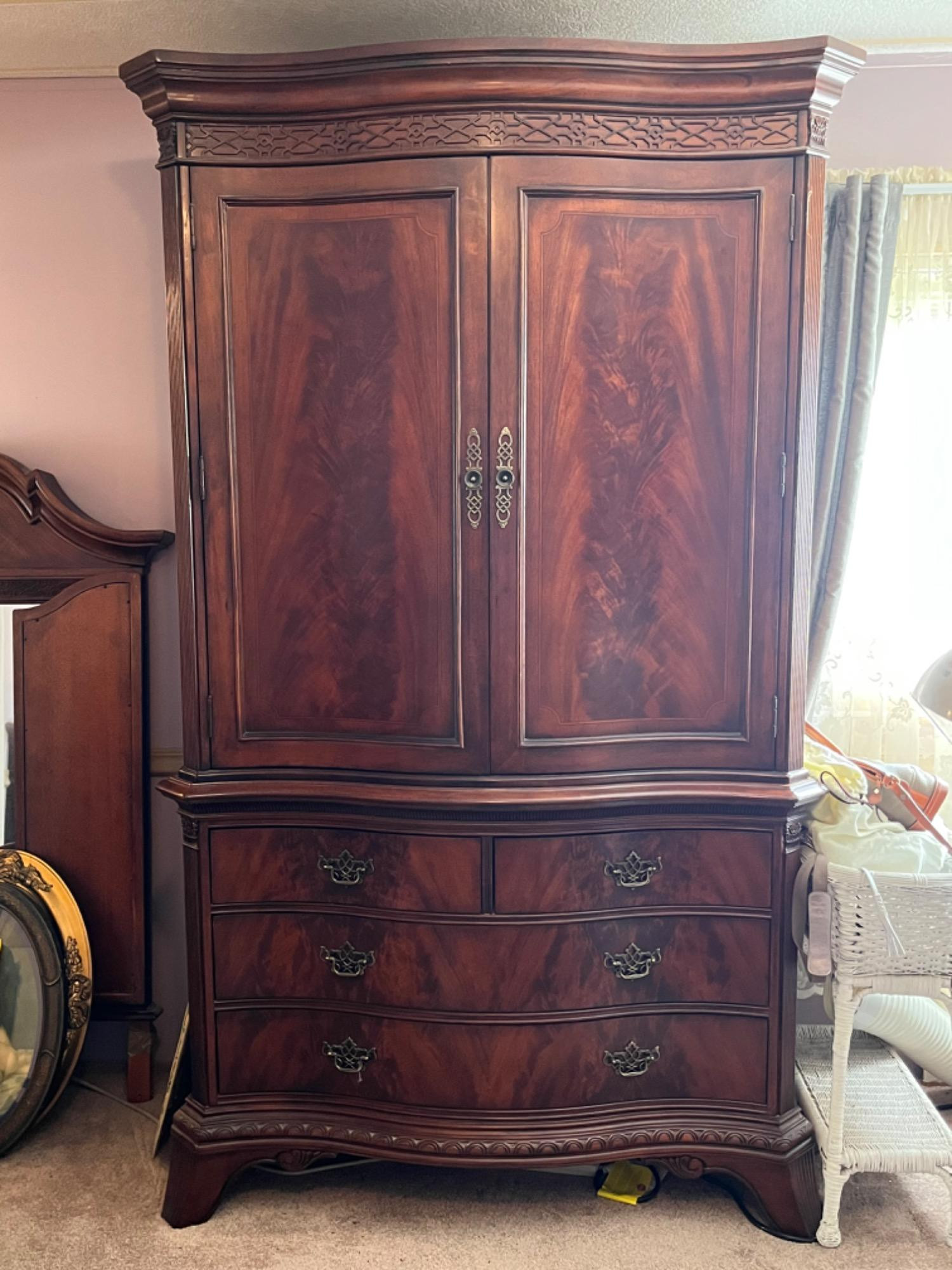Comes in two pieces. Electrical outlets on inside. Measures 83” h x 49” w x 24” d. Very heavy. Matches nightstand and dresser.