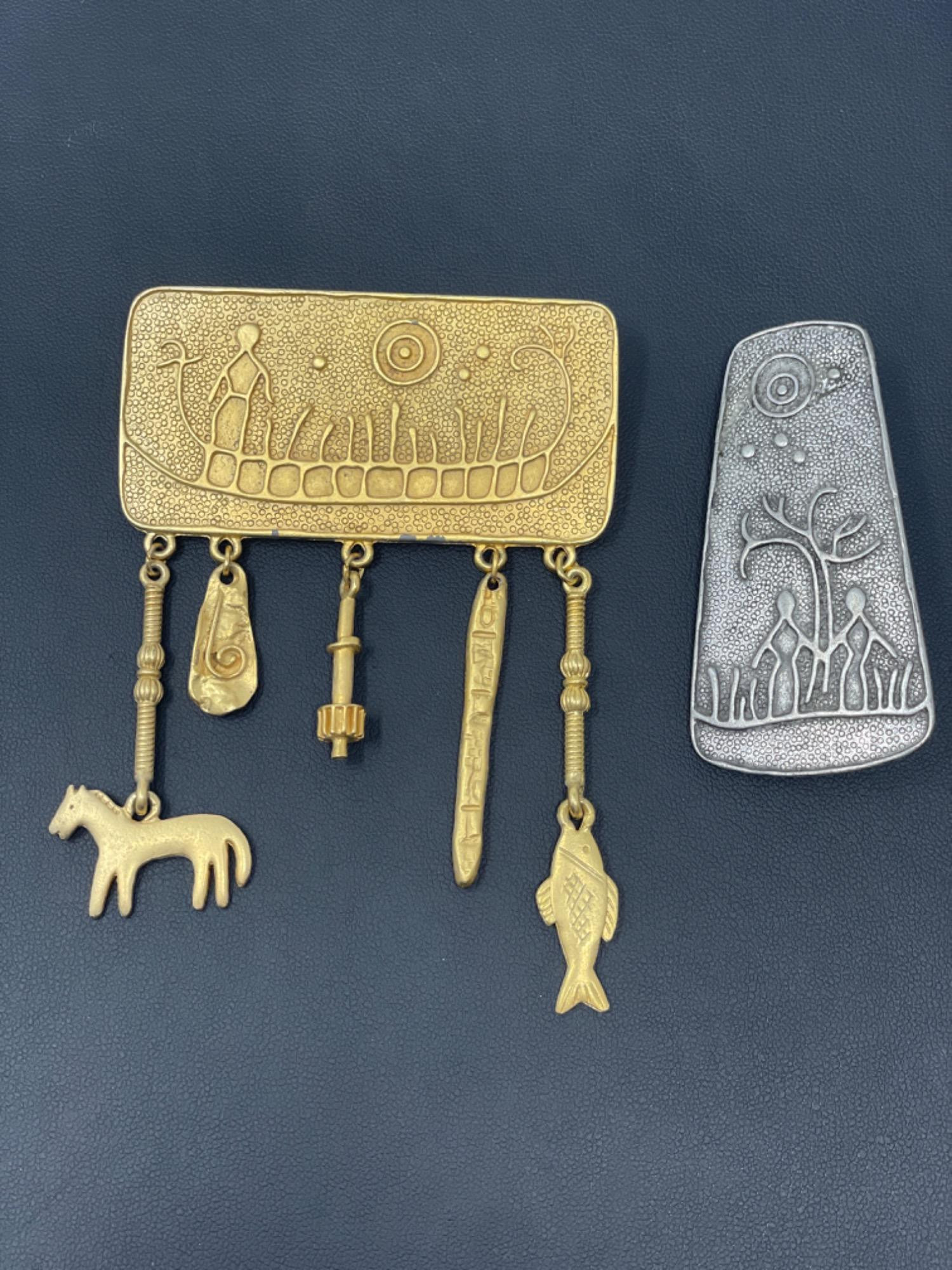 Tribal Petroglyph Metal Brooch With Dangles & Pin