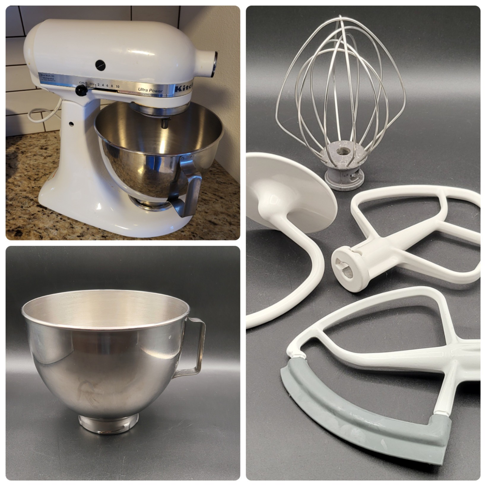 White Ultra Power model, home use Kitchen Aid mixer with 2 stainless steel bowls and several attachments (one has #8 on it) & plastic splash guard. Stainless bowl (size K45). Made in Korea.