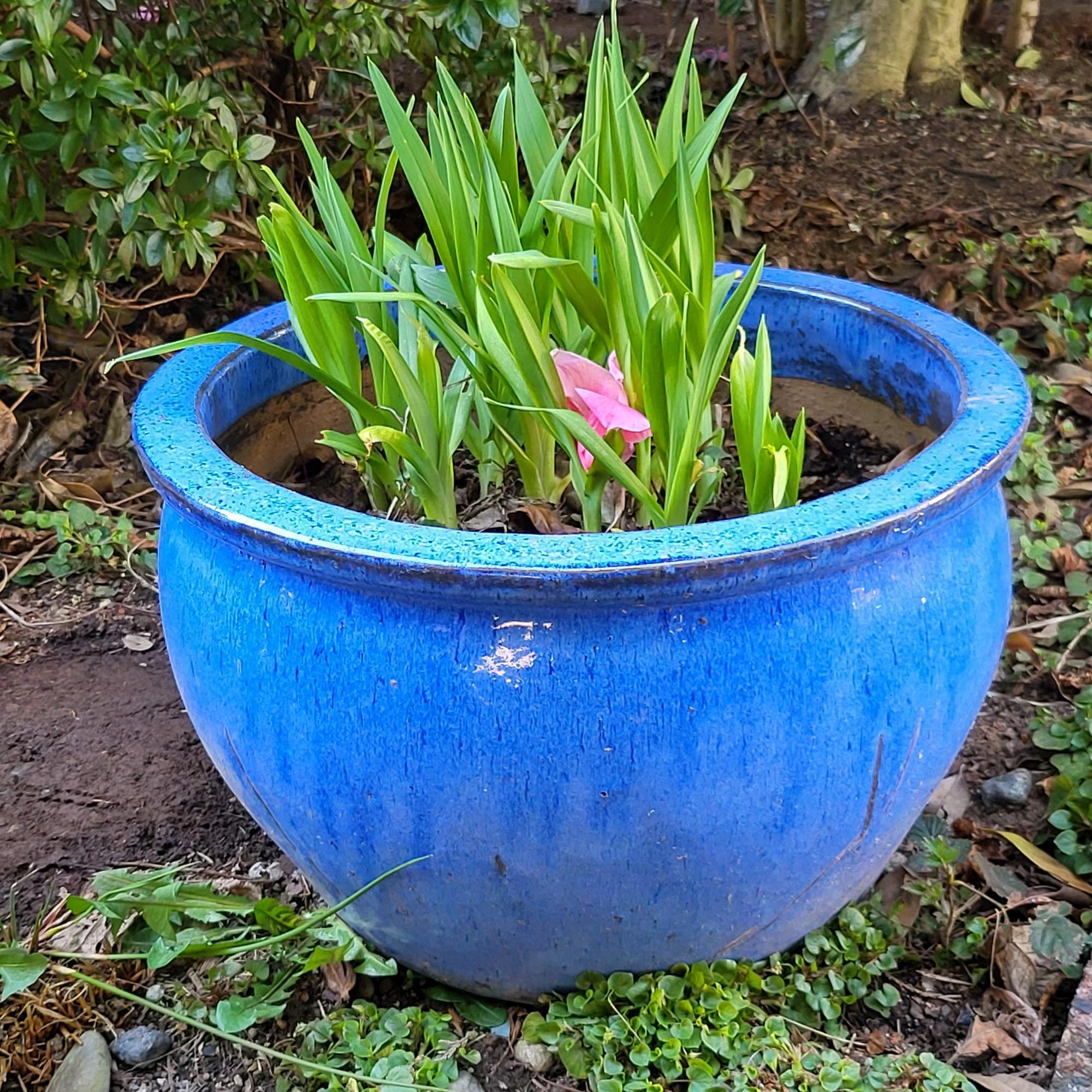 Striking brilliant blue glazed terracotta pot with perennials (just starting to bloom). 16" round and 12" tall. Heavy.