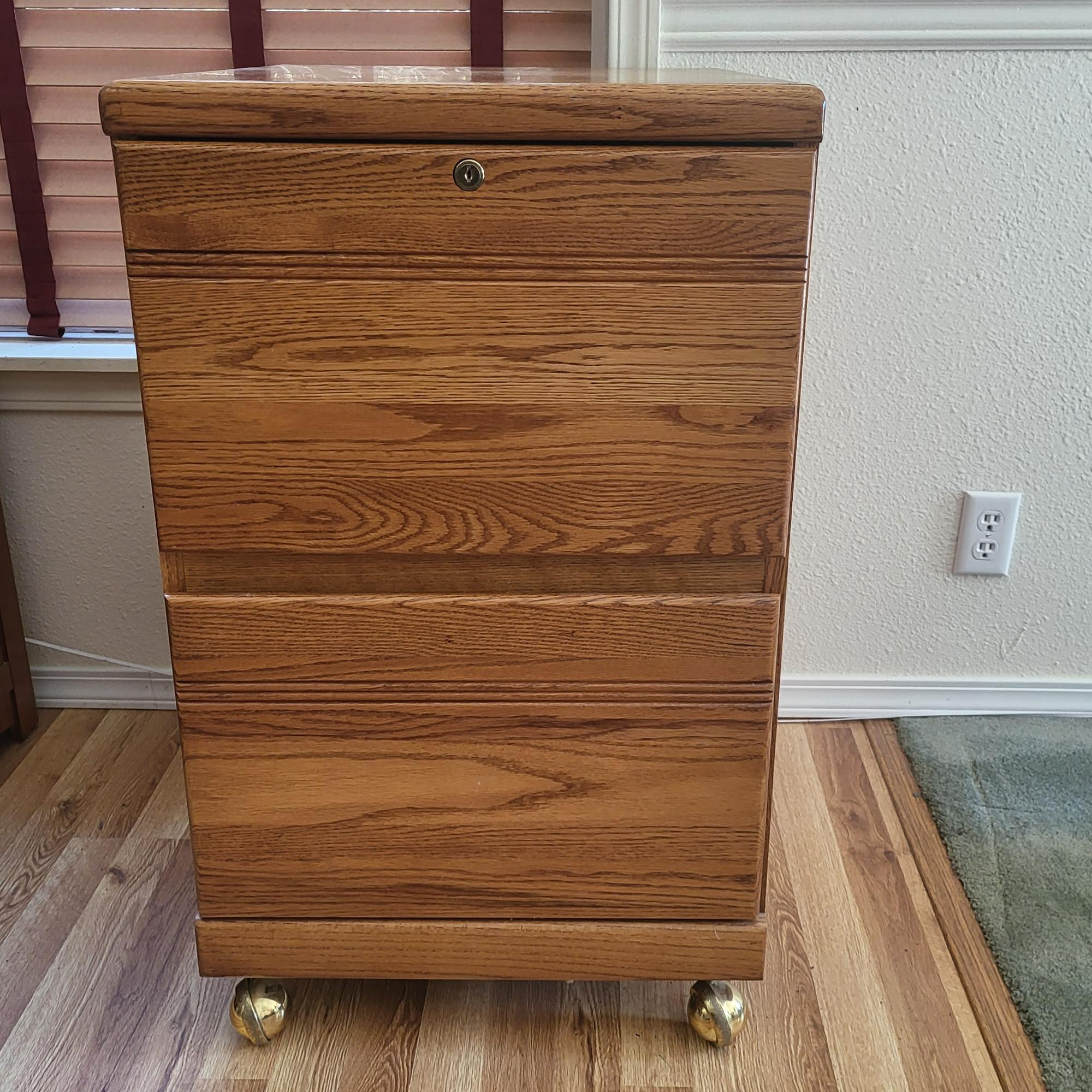 Two-drawer wood file cabinet (like new) is on smooth gliding brass casters. Drawers easily glide open. 20" L x 24" D x 33" T