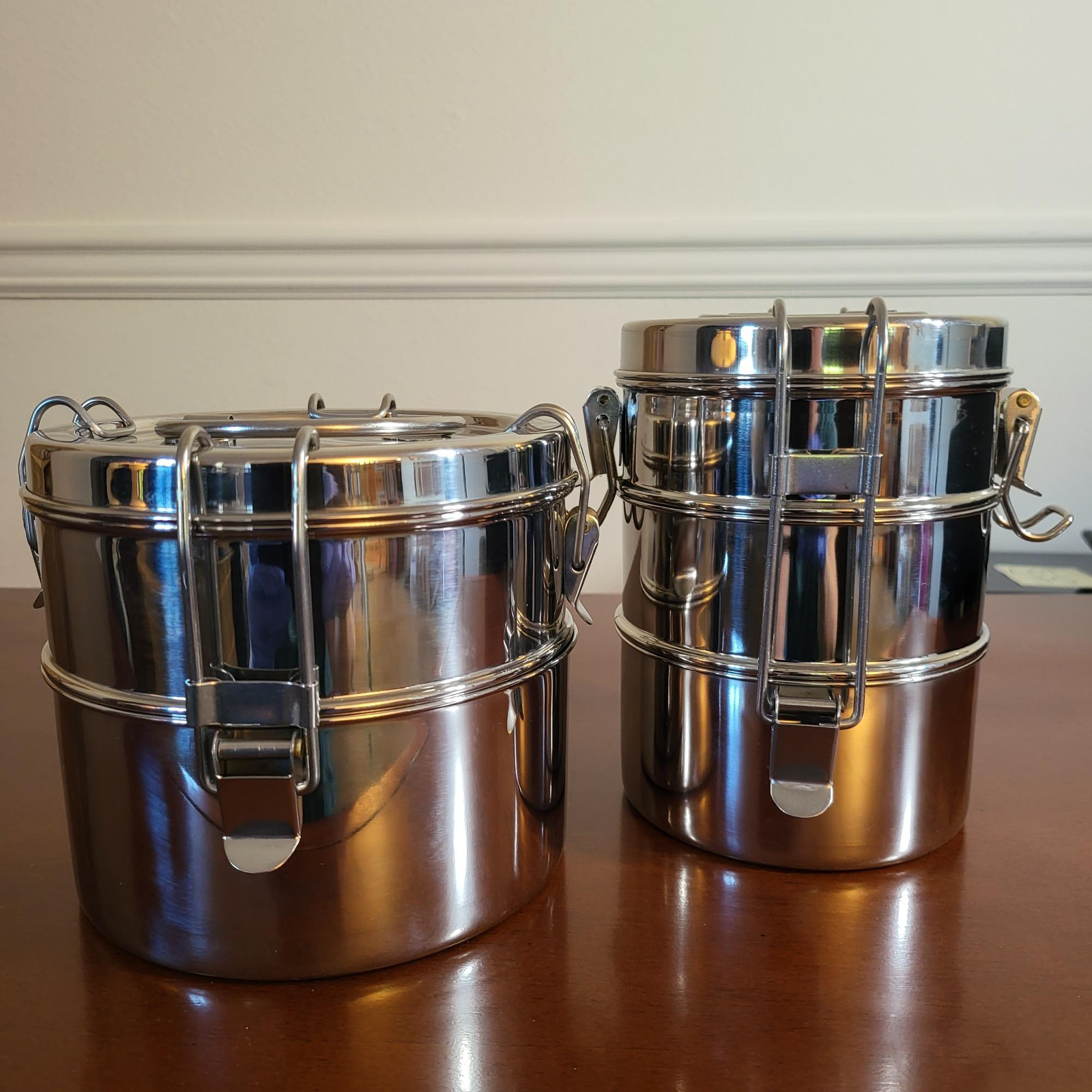 ToGo Wear two-tier and 3-tier stainless lunch box container carriers. High-quality, non-leaching stainless steel is healthier for you and the planet than plastics. Durable, easy-to-clean, dishwasher safe Handle folds down for easy stacking, and lid doubles as a plate