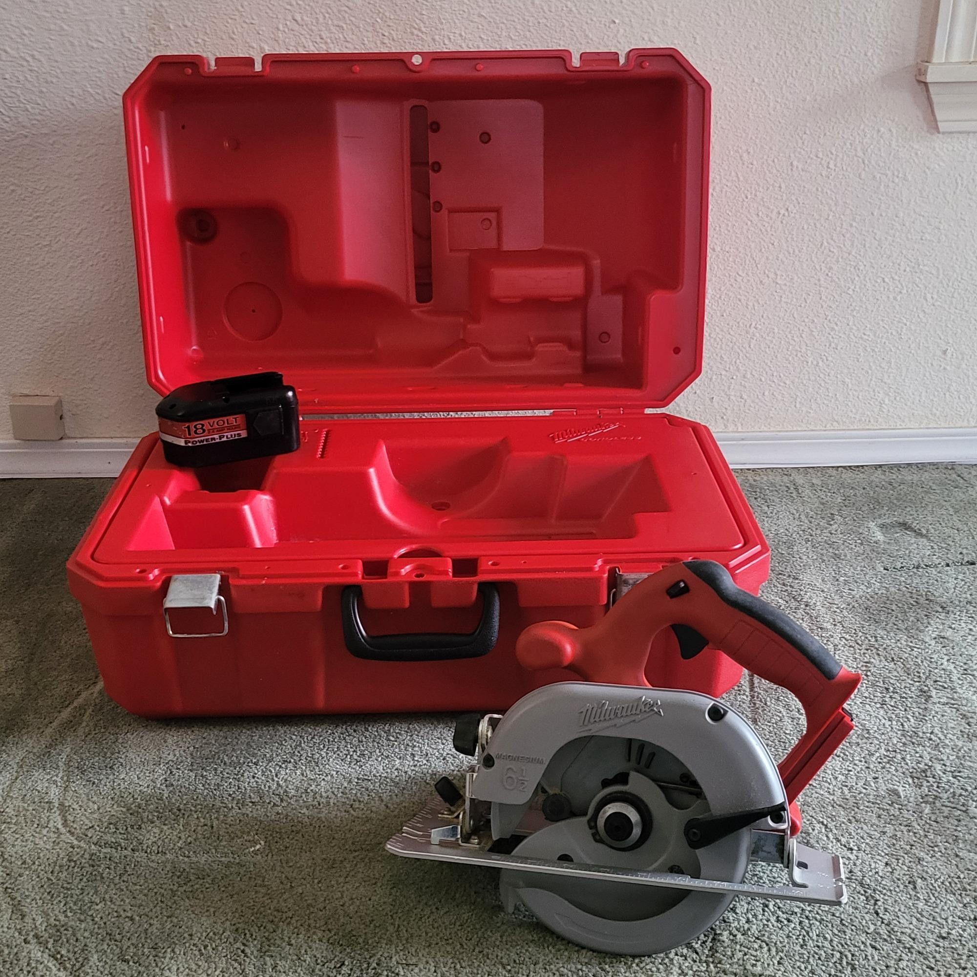 Heavy duty 18Volt Milwaukee 6.5" blade circular saw Model No. 6310-20. Comes with charger and hard plastic storage box.