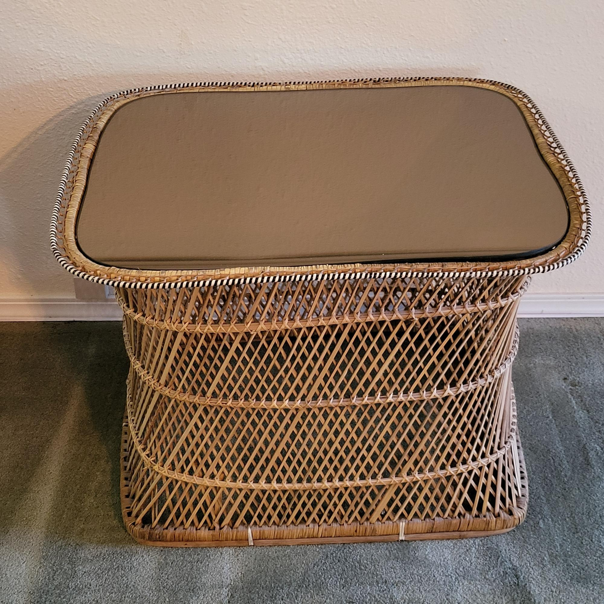 Smokey mirror table top wicker side table. Overall measurements 26" L x 21" D x 19" W
