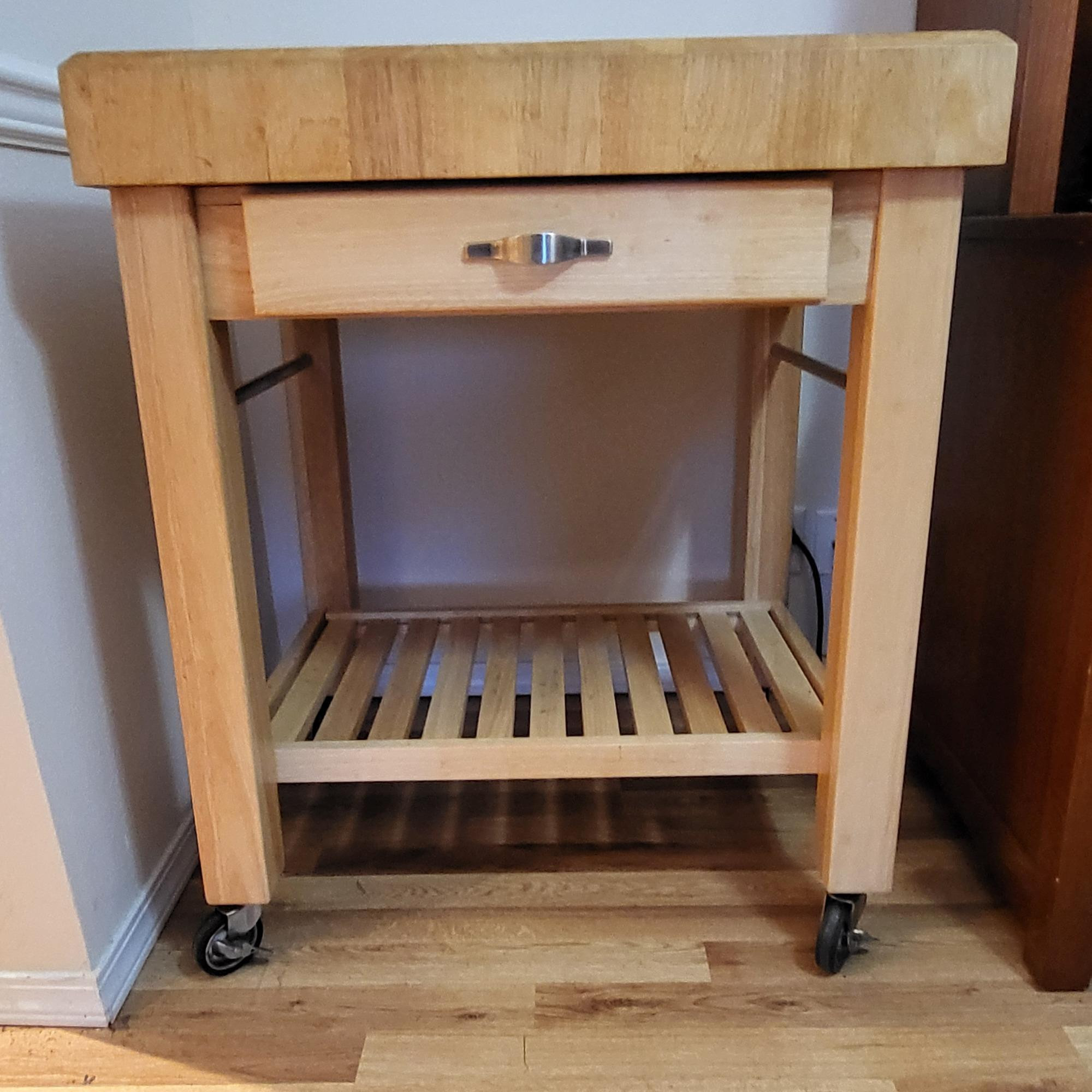 Rolling wood butcher block table. Locking, easy glide casters. Knife slot holder, utensil drawer, two metal bars for towels or hang pans, and a bottom shelf. There is a small wear area that got the most use during food prep, but in overall good condition. Unbranded. 30" w x 24" Deep x 36" Tall.