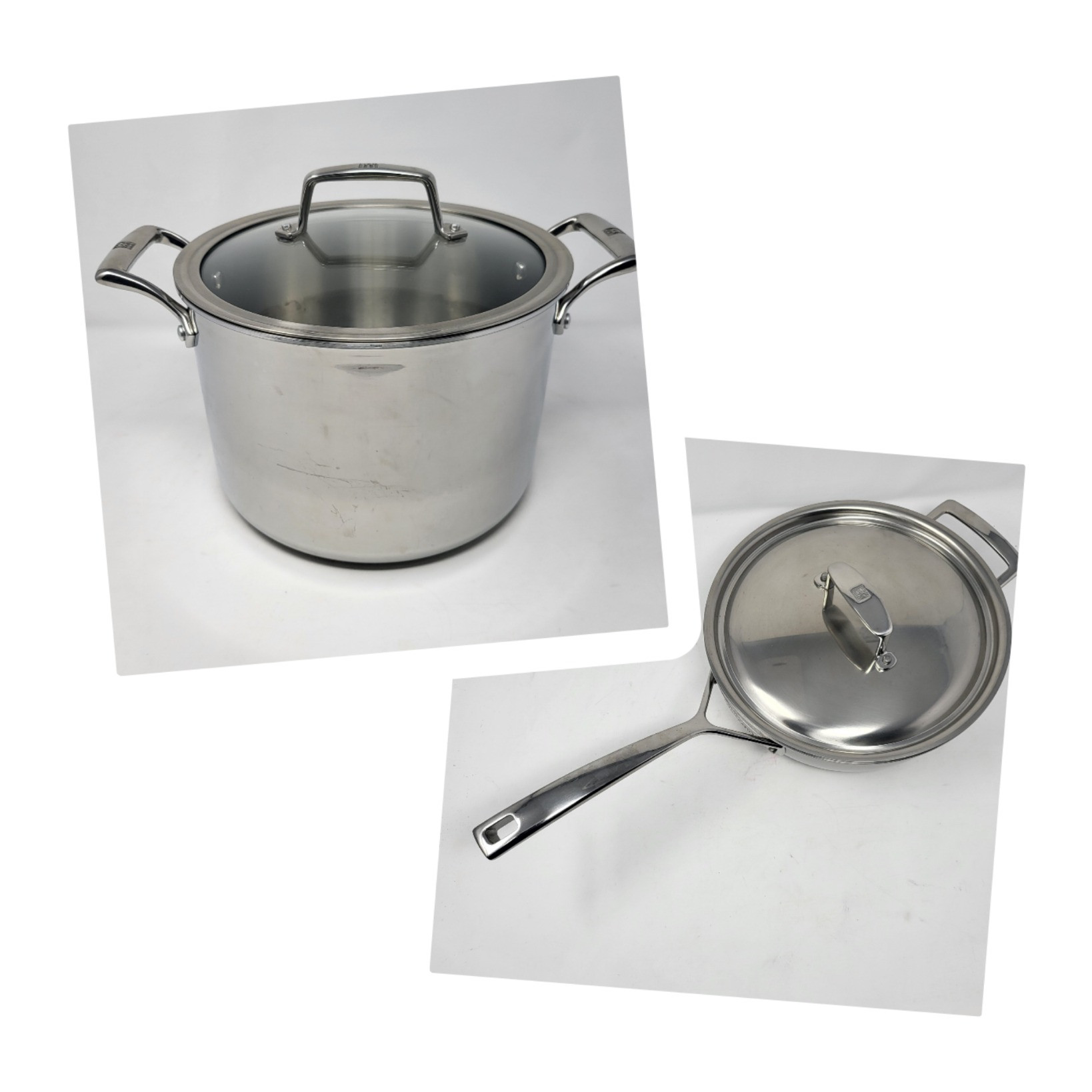 Two Henckels, lidded cookware, induction compatible cookware pots. Stainless Steel 8qt, 10"x7" stock pot with glass lid Stainless Steel 11"x4" pot, 4qt