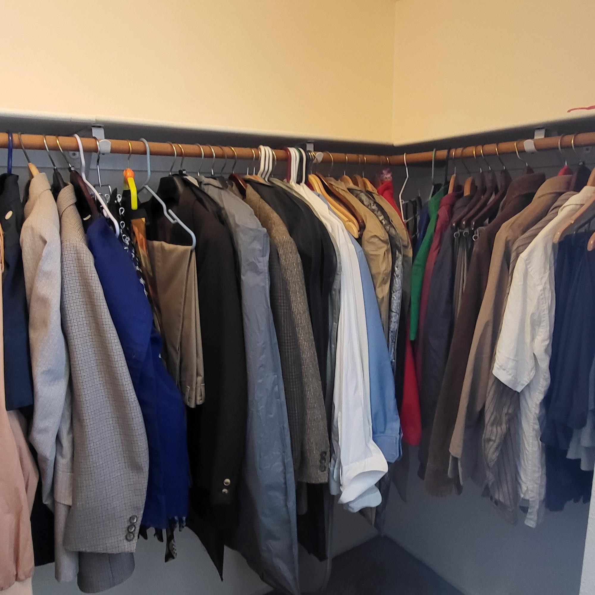 Assortment of men's clothing that you see in the corner of this closet. Includes Shirts, slacks, suits, silk neck ties, and more. Clothes fit is medium size (42). Must take all items