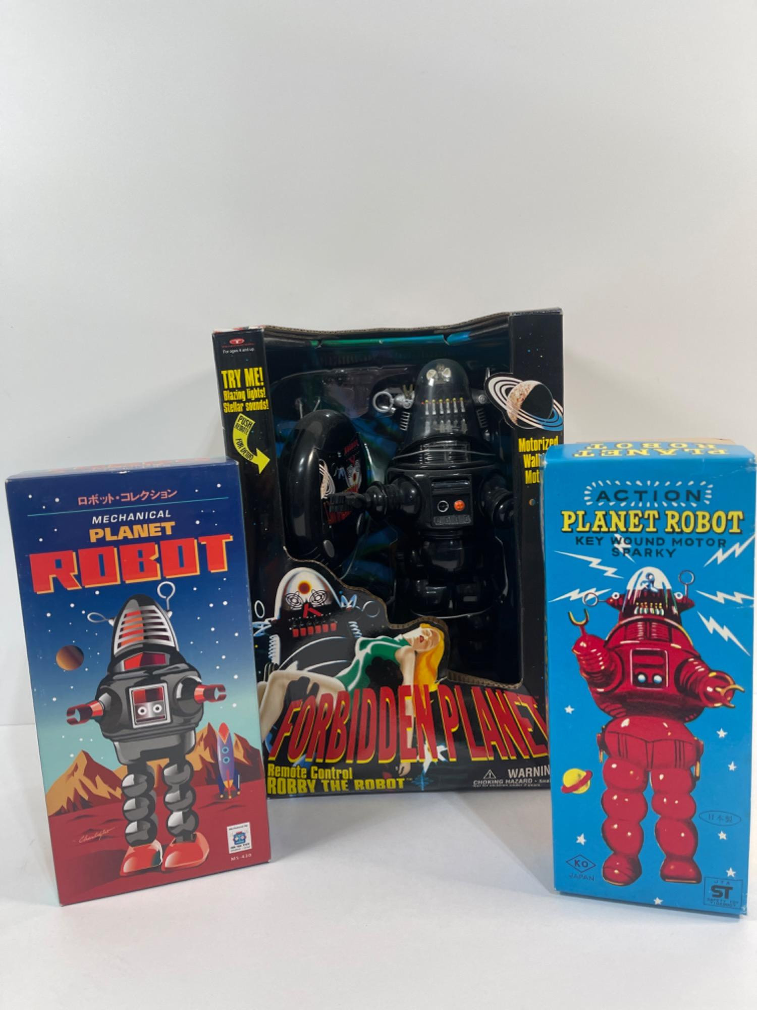Ha Ha Toys Tin Mechanical Planet Robot: 9 inches tall 1999 Trendmasters Forbidden Planet Remote Control Robby the Robot: 11 inches tall - Box is open, dusty 1960s Action Planet Robot KO Yoshiya Japan - 8.5 inches tall