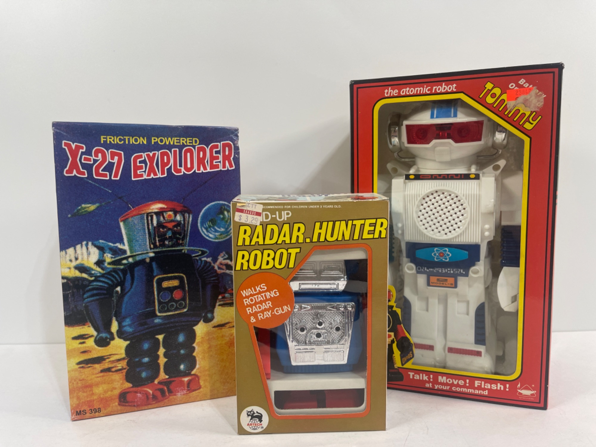 Friction Powered X-27 Explorer: 9 inches tall Radar Hunter Robot: 6.5 inches tall Battery Operated Tomy: 10.5 inches tall UNTESTED All opened, but in good condition.