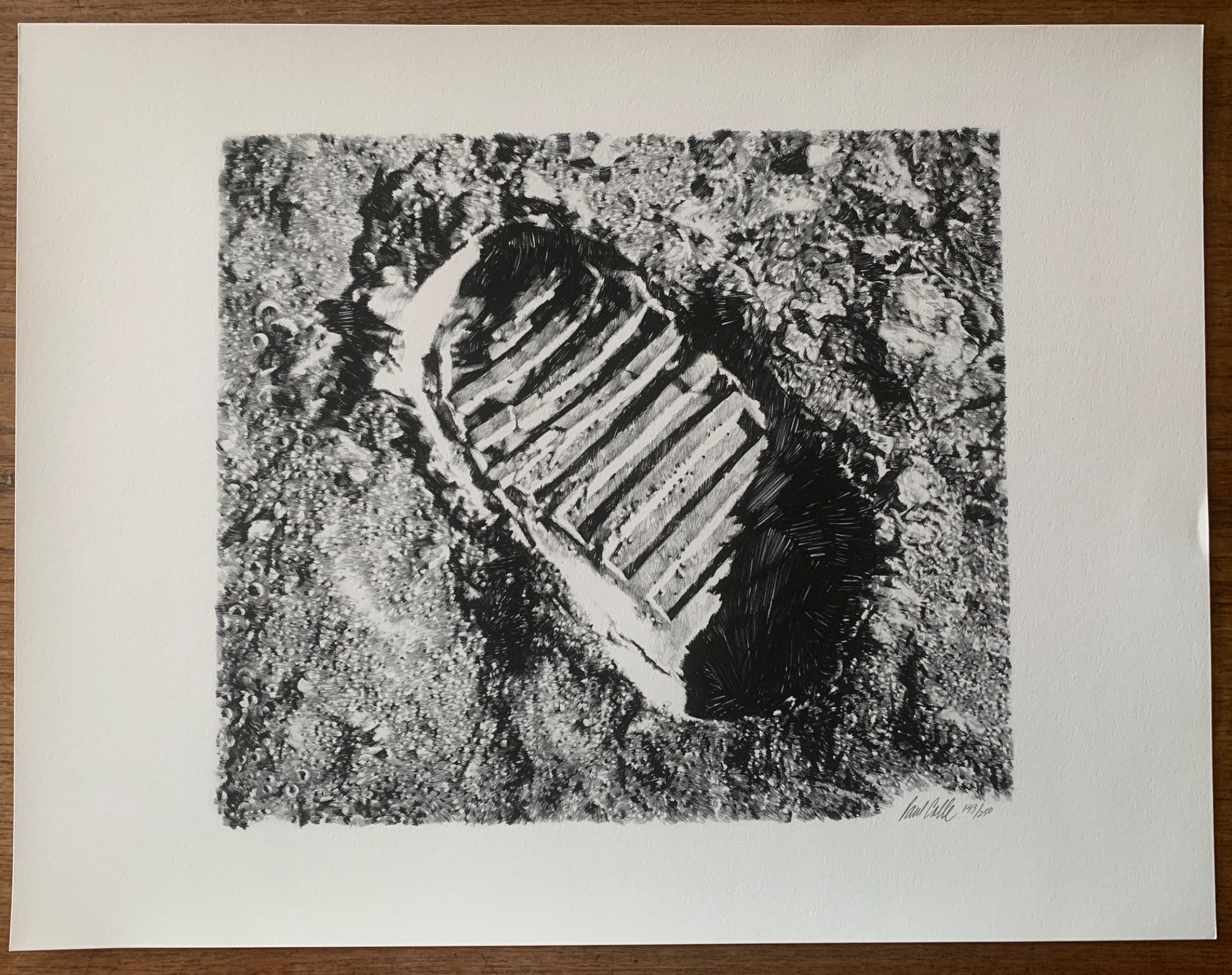 Limited edition Paul Calle giclee print entitled FIRST STEP ON THE MOON. This is #143 from an edition of 250. Exquisite detail in the fine cross-hatching and shading; the blacks are rich and deep while the gray variants are amazing - the work gets better and better the closer you look. Printed on heavy paper with Calle's signature and edition number in pencil on the lower right. Calle (1928 - 2010) was present for the Apollo 11 suiting up/breakfast before launch and documented artistically the activities and astronauts of this flight and others over his 30-year career as an official NASA artist. He was known for his distinctive pen & ink sketches. Print paper measures 17" H x 22" W. Printed area measures 12.75" H x 14.75" W. Unframed. In fantastic condition with no noticeable flaws. Shipping available only through Fed Ex Pack & Ship