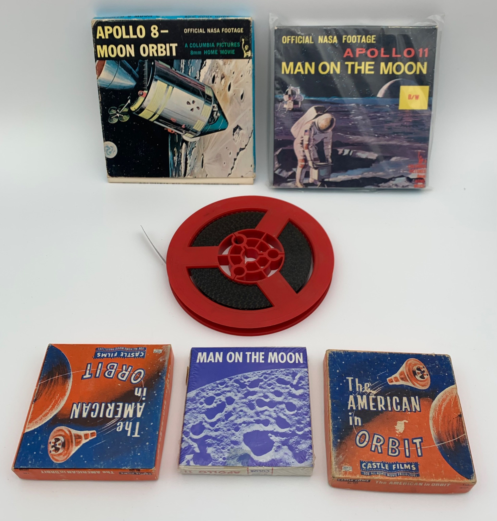 Six Super 8 movie reels focused on the space program. The two larger reels in boxes are NASA footage from Columbia Pictures Home Movies. The third large reel (red) does not have its box but it appears to be moon landing-related - see photo. The three smaller boxes are also Super 8. Two of them are entitled “THE AMERICAN IN ORBIT” from Castle Films. The final reel is “ON THE MOON” from Visual Science Productions of LA. We believe all are vintage 1960s. Larger reels measure 5" W; smaller reels measure 3" W.