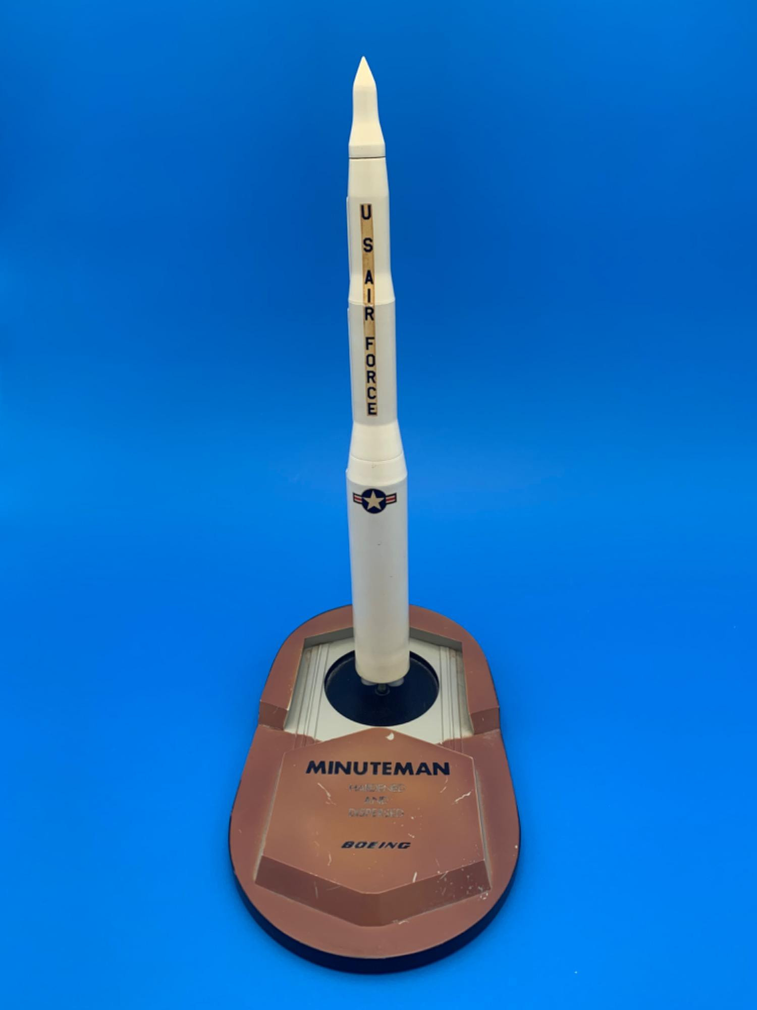 Vintage model of Boeing Minuteman missile. Set on molded plastic base with inscribed and printed label reading “Minuteman - hardened and dispersed.” Missile bears US Air Force decals & is supported by a metal pin-mount to the base. Vintage Precision model. Measures 14.5" H x 6" W x 10" D Note: there is considerable wear on the base section – please see final photo. Shipping available only through Fed Ex Pack & Ship