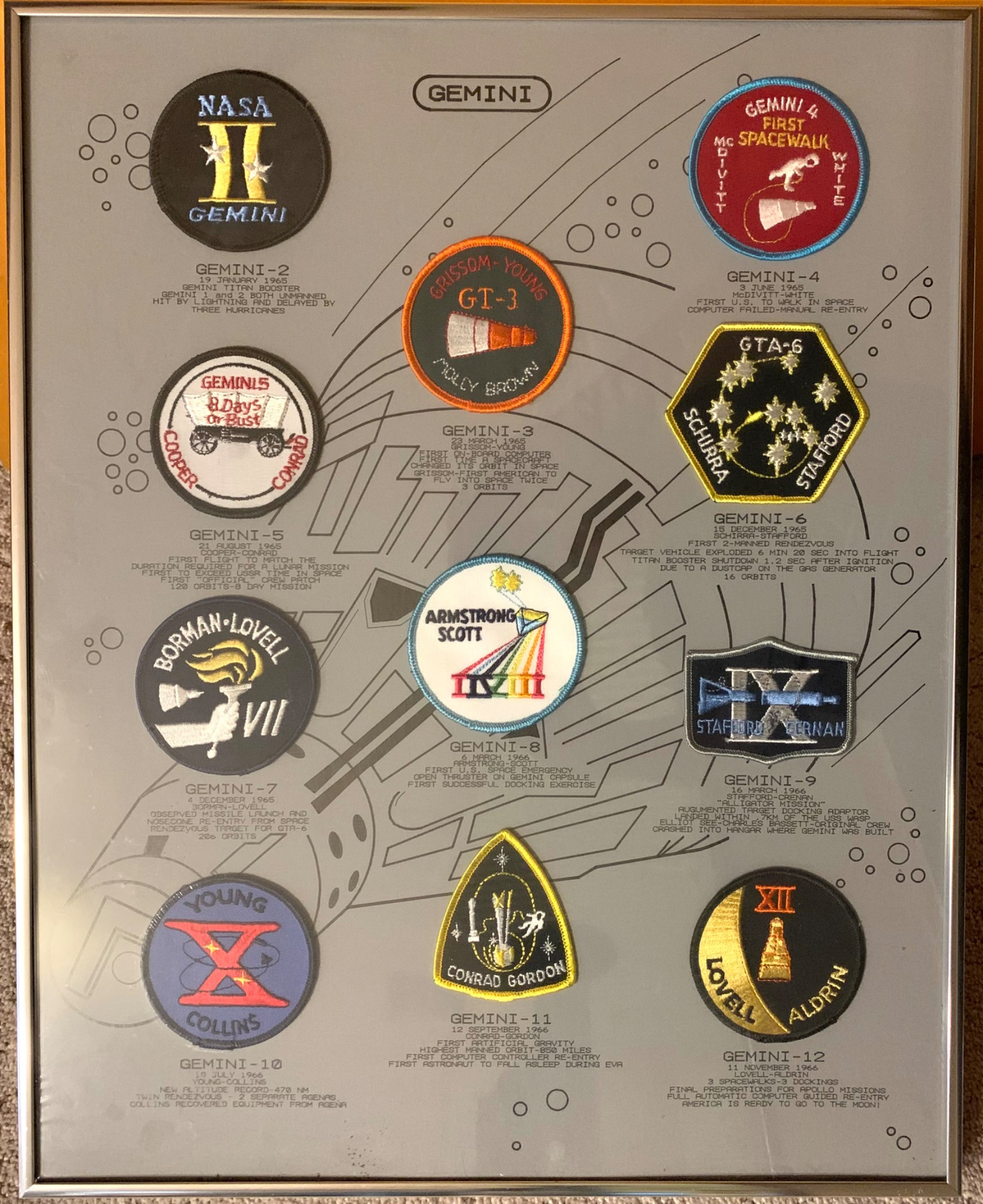 Gemini commemorative patches from Moments In Space of Santa Clara, CA. Project Gemini emblem patches - 11 in all - mounted on a gray graphic background with information on each mission below. Grey background & emblems are shrink-wrapped in plastic and then framed. Colors are still vivid almost 30 years after creation. More detailed information about the Gemini Project in general on verso. Silver frame. Measures 16" H x 20" W framed. Note there appears to be a possible fingerprint or dirt along the lower background near frame; not highly visible - see last photo. Could probably be brushed away if frame were removed. Shipping available only through Fed Ex Pack & Ship