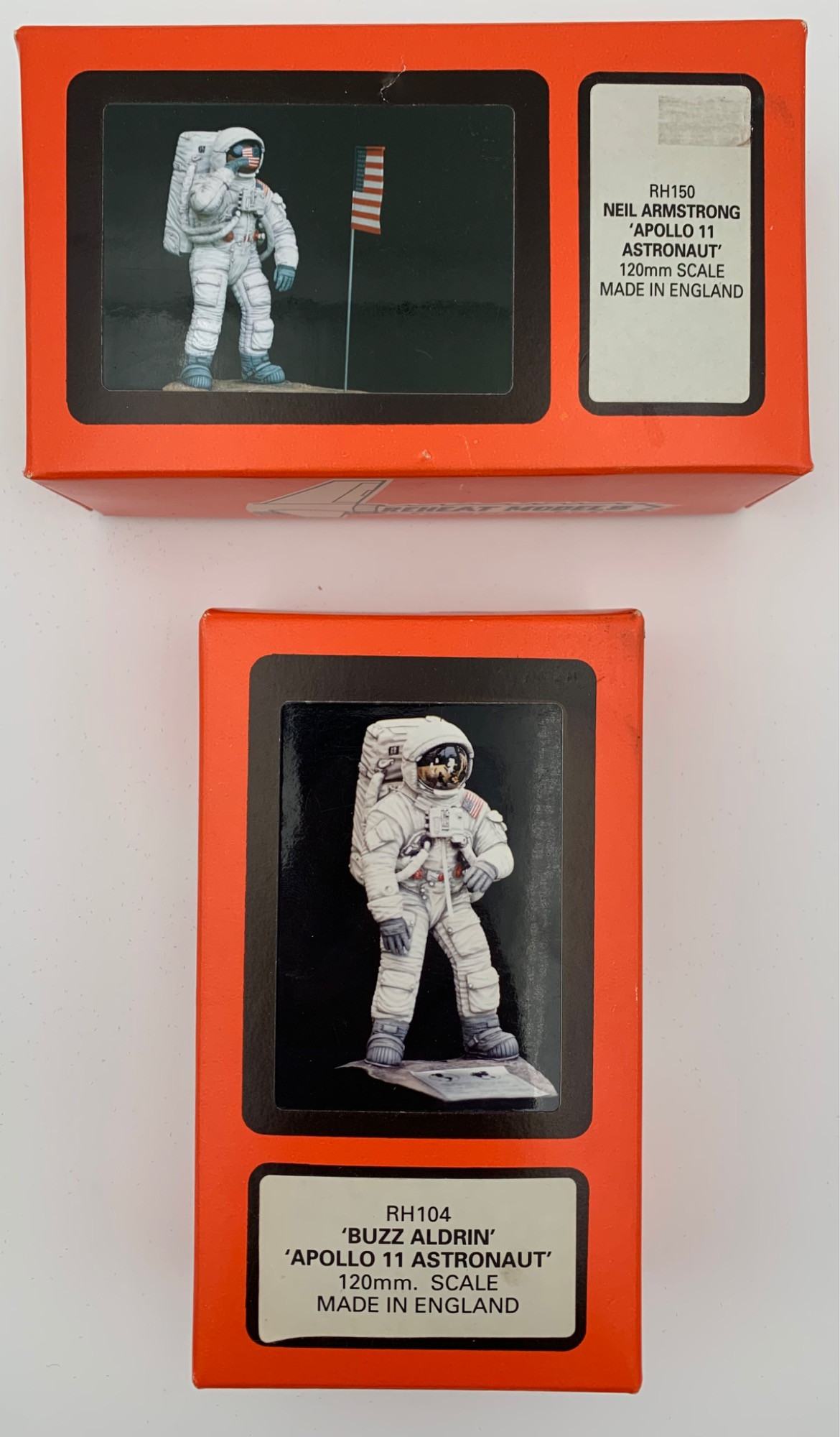 Hard-to-find Reheat Models' small scale renditions of Buzz Aldrin (RH #104) and Neil Armstrong (RH #150) from their Apollo 11 flight. Made in England, they appeal to specialty collectors. These two kits appear to have intact interior packaging and boxes are in good shape. 120mm scale. Shipping available only through Fed Ex Pack & Ship