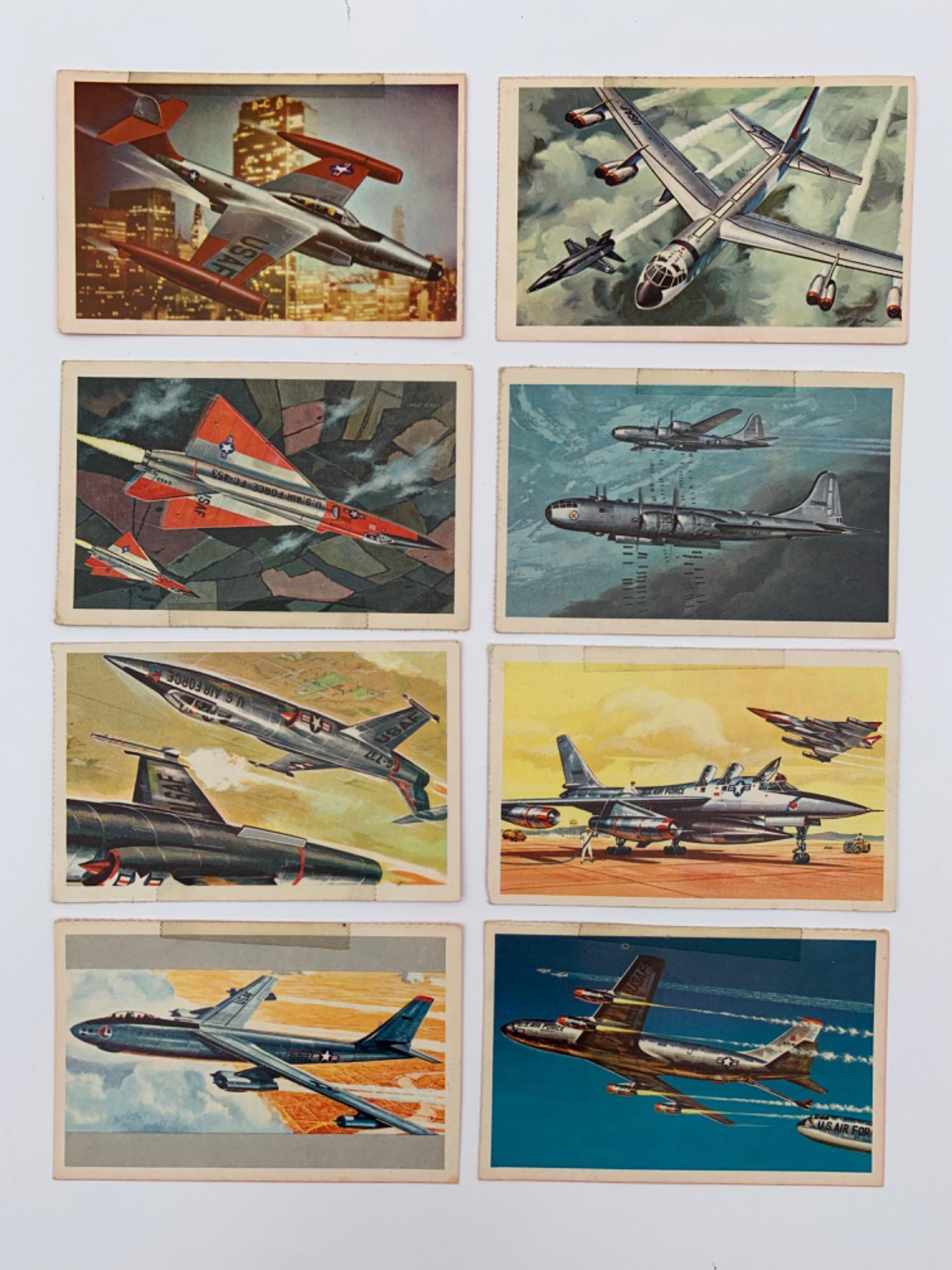 Revell Historic Collectors Cards - from the "Air Power" series; all United States Air Force - 8 in all. These cards were included in Revell model kits in the early 1960s. Color rendering of the aircraft on front and info about the craft on verso, In good shape except former owner - probably as a kid - used cellophane tape to put them up. Tape is still on cards, but could be professionally removed. Measure approx. 2.75" H x 3.75" W. Please see photos to gauge your tolerance for the tape. Missing cards #5, #6, #9, and #10 from set of 12.