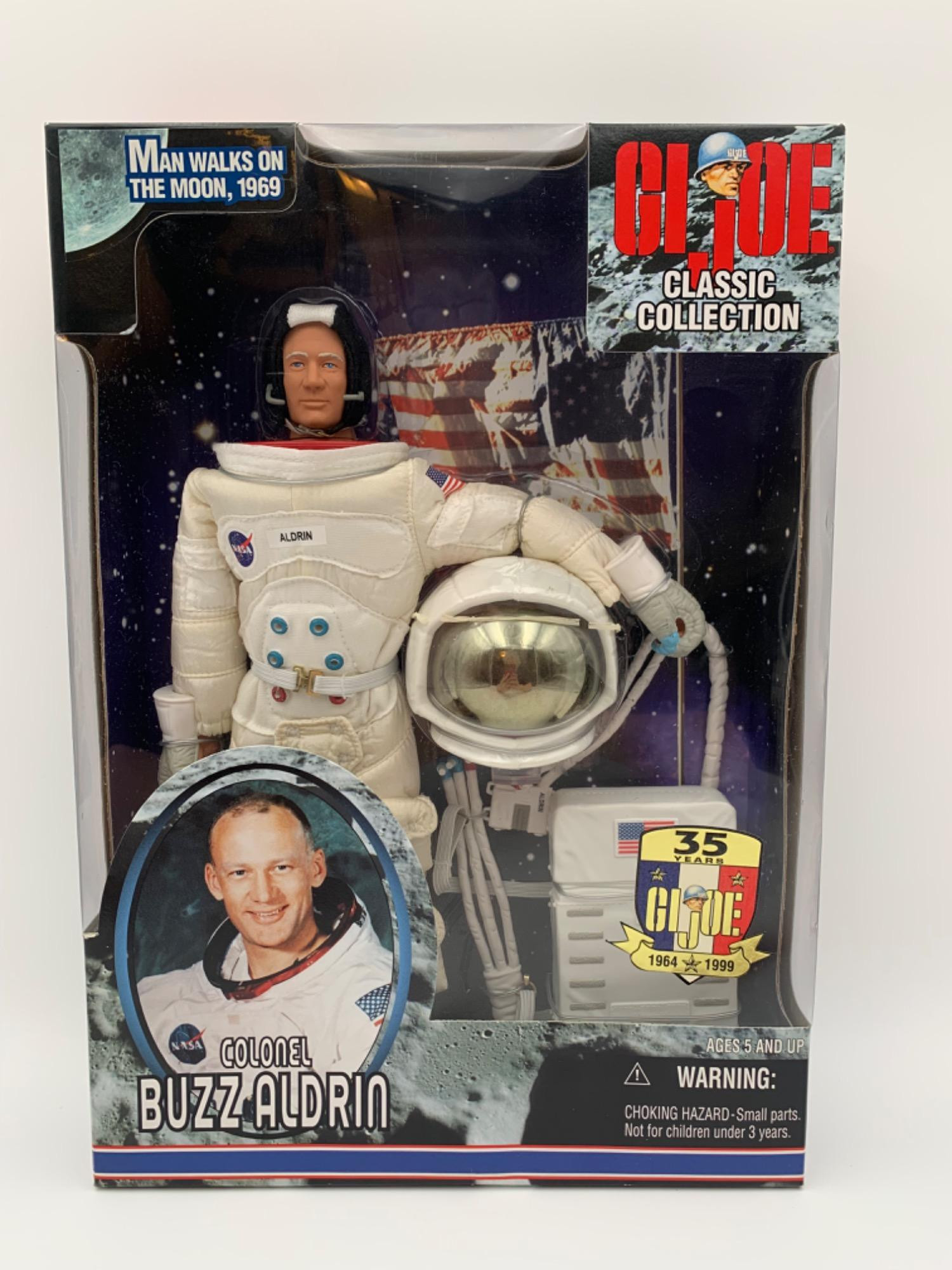 Buzz Aldrin action figure from the G.I. Joe Classic Collection commemorating the 35th anniversary of G.I. Joe (1999). 12" H. Aldrin comes complete in his moon suit with helmet and extra misc. gear. Appears to be in new in original packaging with seals unbroken - please see photos to determine for yourself. Hasbro assortment #81525/81521.