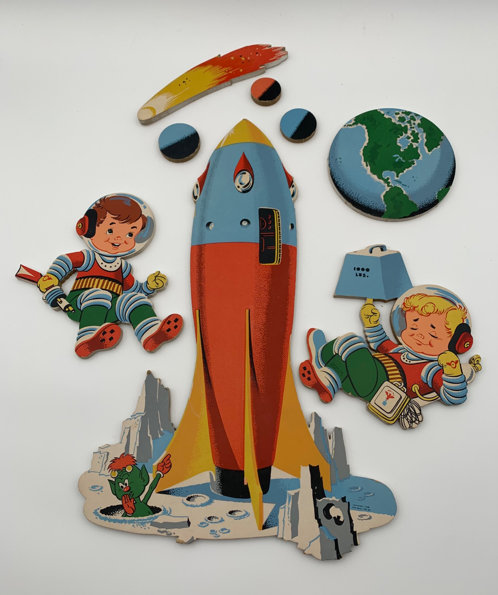 Truly great 1950s space graphics from Dolly Toy Company of Ohio. Very vivid color despite age and in amazing condition for being 65 years old. Even the Martian has retained his rich green skin tone. Each component can be hung separately for flexibility in arrangement. High-quality printing on quarter inch press board. Only a couple of very small paper areas rubbed away on rocket - not noticeable unless inspecting closely - see last two photos. Largest piece is the rocket measuring 18" H x 12" W. Smallest planet piece measures 1.5" W. Shipping available only through Fed Ex Pack & Ship