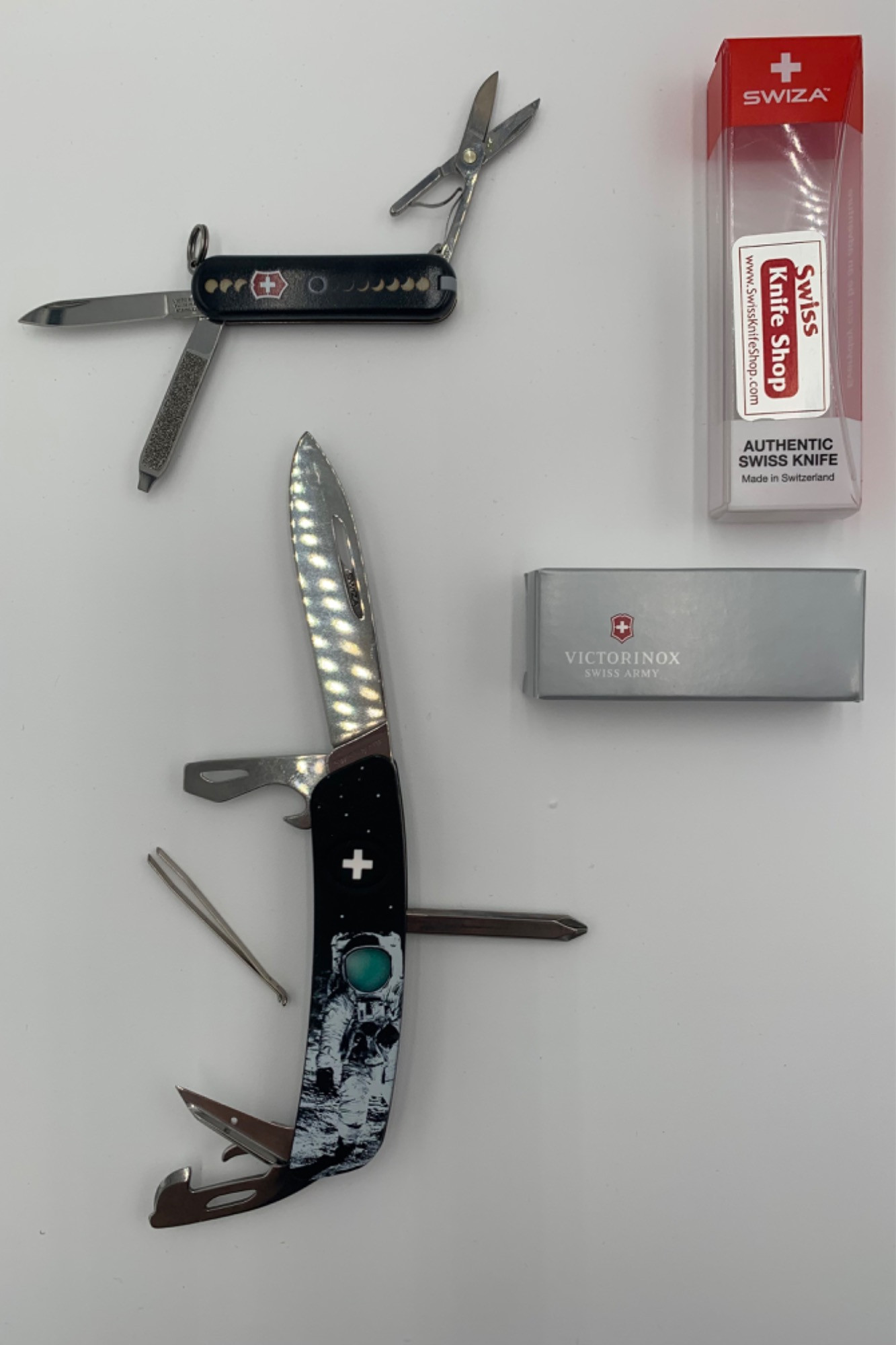 Pair of moon-themed pocket knives with various tools. Larger Swiza knife celebrates the 50th anniversary of the moonwalk with an astronaut on one side and the famous lunar footprint on the other. Multiple tools, including removable tweezers. Measures 3.75” closed. Smaller Victorinox knife, shows phases of the moon. Measures 2.25” closed . Both knives are new and unused with boxes included.