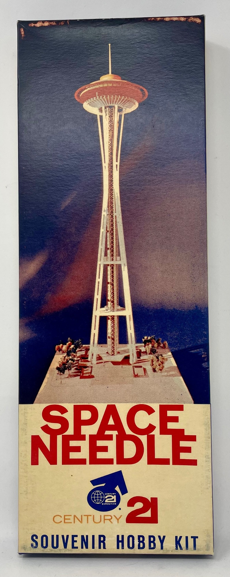 Century 21 Official World's Fair Space Needle model from Stalco Products Co. 1962. In original box with instructions and sealed parts package (box measures 15.75" L x 5.75" W x 1.25" D). Also included is original cardboard shipping box. Finished model is 18" H. Shipping available only through Fed Ex Pack & Ship