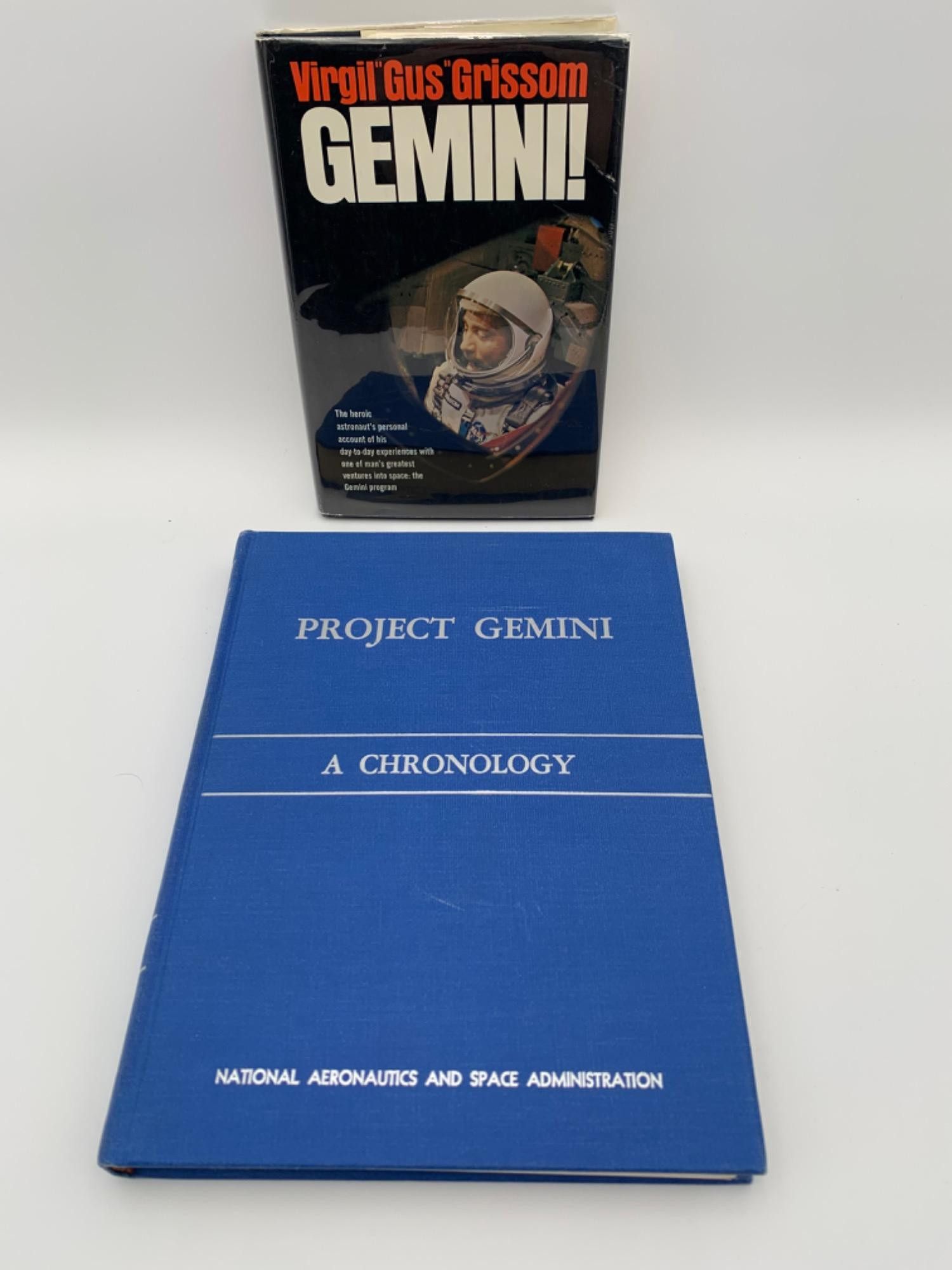 Pair of Project Gemini books in good condition. GEMINI by astronaut Virgil "Gus" Grissom. Hardcover with dust jacket/plastic jacket protector. 1968, first printing, Macmillan Co. (New York NY). 212 pages. Good condition. PROJECT MERCURY - A CHRONOLOGY - TECHNOLOGY AND OPERATIONS by James M. Grimwood, Baron C. Hacker, & Peter J. Vorzimmer. Hardcover. 1969, NASA SP-4002 (Washington DC). 308 pages. Very good condition with a small scratch on front cover. Please see photos to judge the condition of the books yourself.