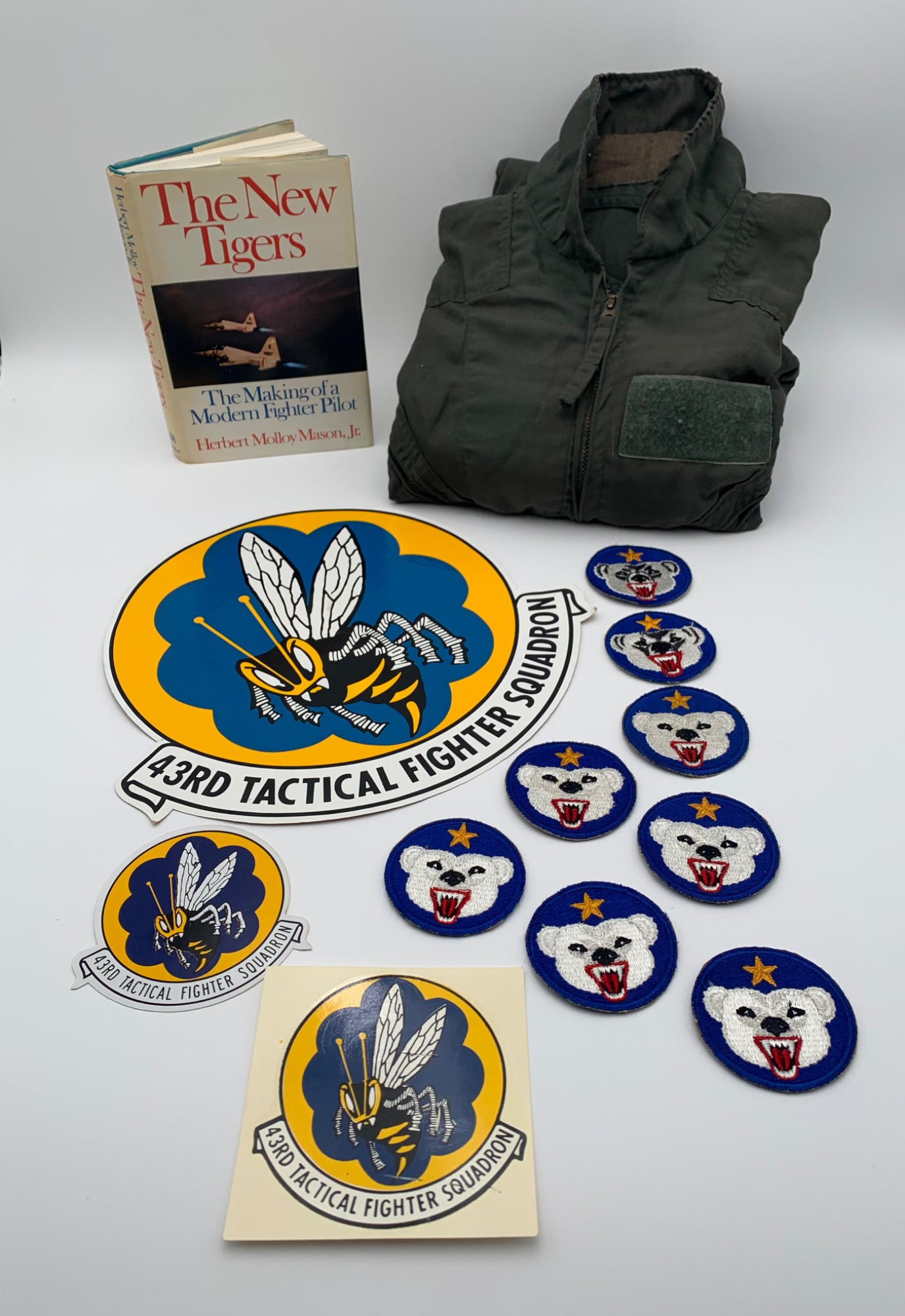 Amazing lot for anyone fantasizing about being a jet fighter pilot! All items are authentic (our client was a Air Force Phantom jet fighter pilot IRL) and while most items have been used, they are in great shape unless otherwise noted. Flight Suit - this is the real thing worn by our client. Has zip-front closure with 2-way zipper, Velcro waist adjustment w/elastic belt band, a pair of zip breast pockets, pocket with zip on left sleeve, Velcro cuff closures, armpit ventilation holes, thigh pocket w/ zip closure, shin pockets with zip, boot gussets with zip, hip pockets with through access for pants pockets, and rank bars on shoulders. It has been worn (visible repair to lower left thigh area and some zipper welt wear as well as a small hole in the arm pocket & some occasional pulls/snags), but still great for that would-be pilot! No size tag, but client was on smaller side - this suit would probably fit females, too . Measures 20" pit to pit, 17.5" side to side at waist, and 55" from shoulder seam to pants hem. 43rd Tactical Squadron stickers (2 small & one large - large measures 11.5" top to bottom). Based in Florida, this is one of the first tactical squadrons in existence and it also served in Alaska during the Cold War. 8 sew-on polar bear insignia patches - we believe these are vintage Alaska Defense Command patches (measure 2.5" across). Note: they appear to be of varying vintage - some with black on the bear's face. Some have been used, but all are in good shape - see photos. THE NEW TIGERS - THE MAKING OF A MODERN FIGHTER PILOT by Herbert Molloy Mason, Jr. Hardcover. 1973, David McKay Inc (New York NY). 263 pages. In good used condition. Book details the Tactical Air Command process and what goes into the training of these pilots.