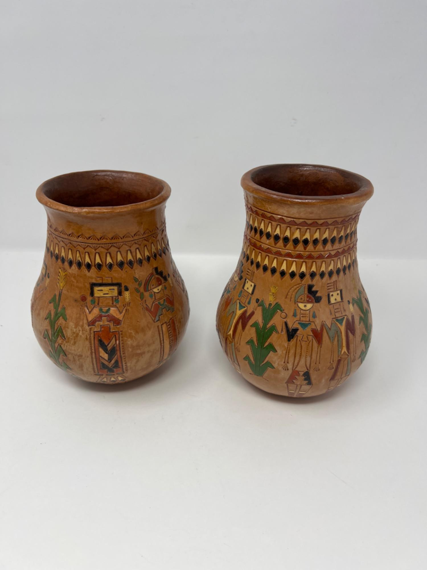 Yei Pot Corn People. Navajo pottery. 6.25” tall and 6.5” tall. 5” diameter at widest part and 3.5” opening.
