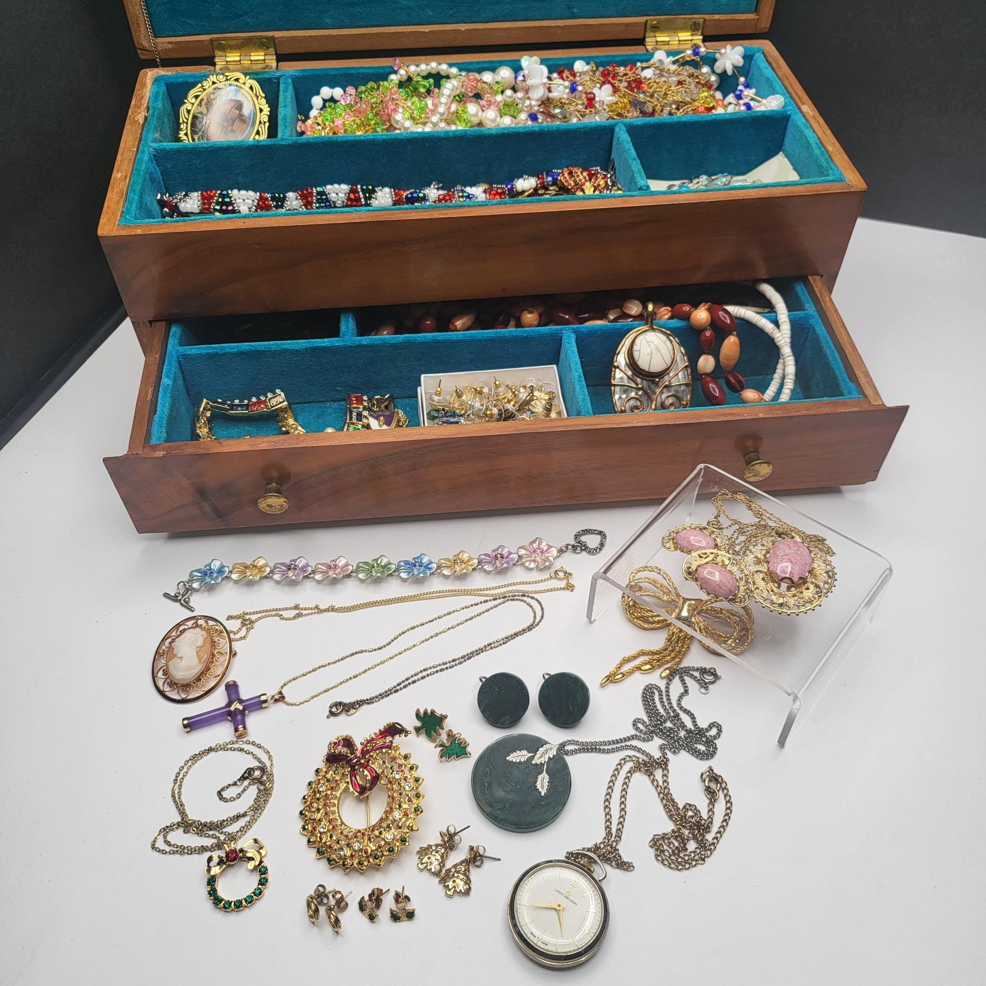 Lot # 138 - Mid-Century Wood Jewelry Box Filled With Vintage Fashion Jewelry