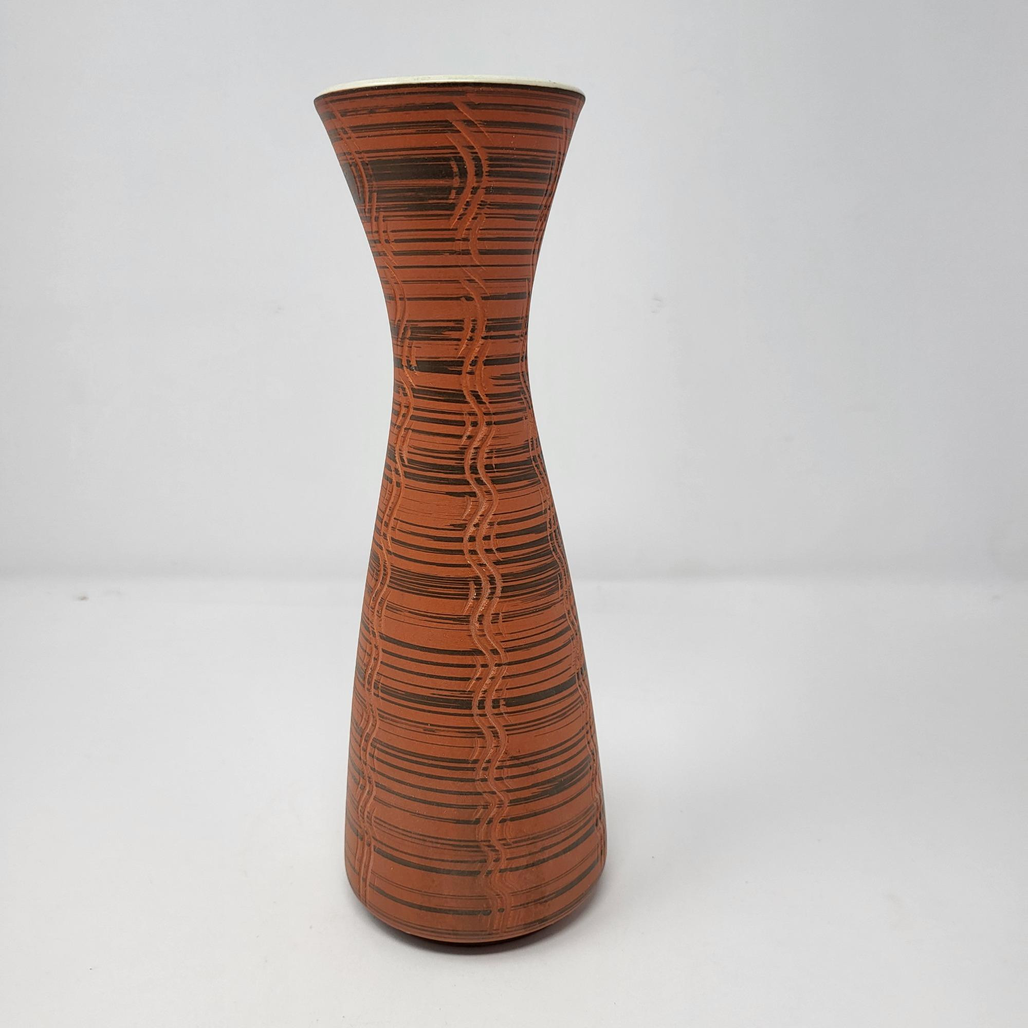 Mid Century Pottery Vase - Squiggly Lines Design. May be DUMLER UND BREIDEN Terra and Brown Mid Century Vase made in West Germany. Stamp on bottom says: 1302 25 which is a standard stamp for the Dumler Und Breden Company. Terracotta vase and porcelain finish inside. 11" tall brown pottery vase with black horizontal lines and vertical squiggly etching.