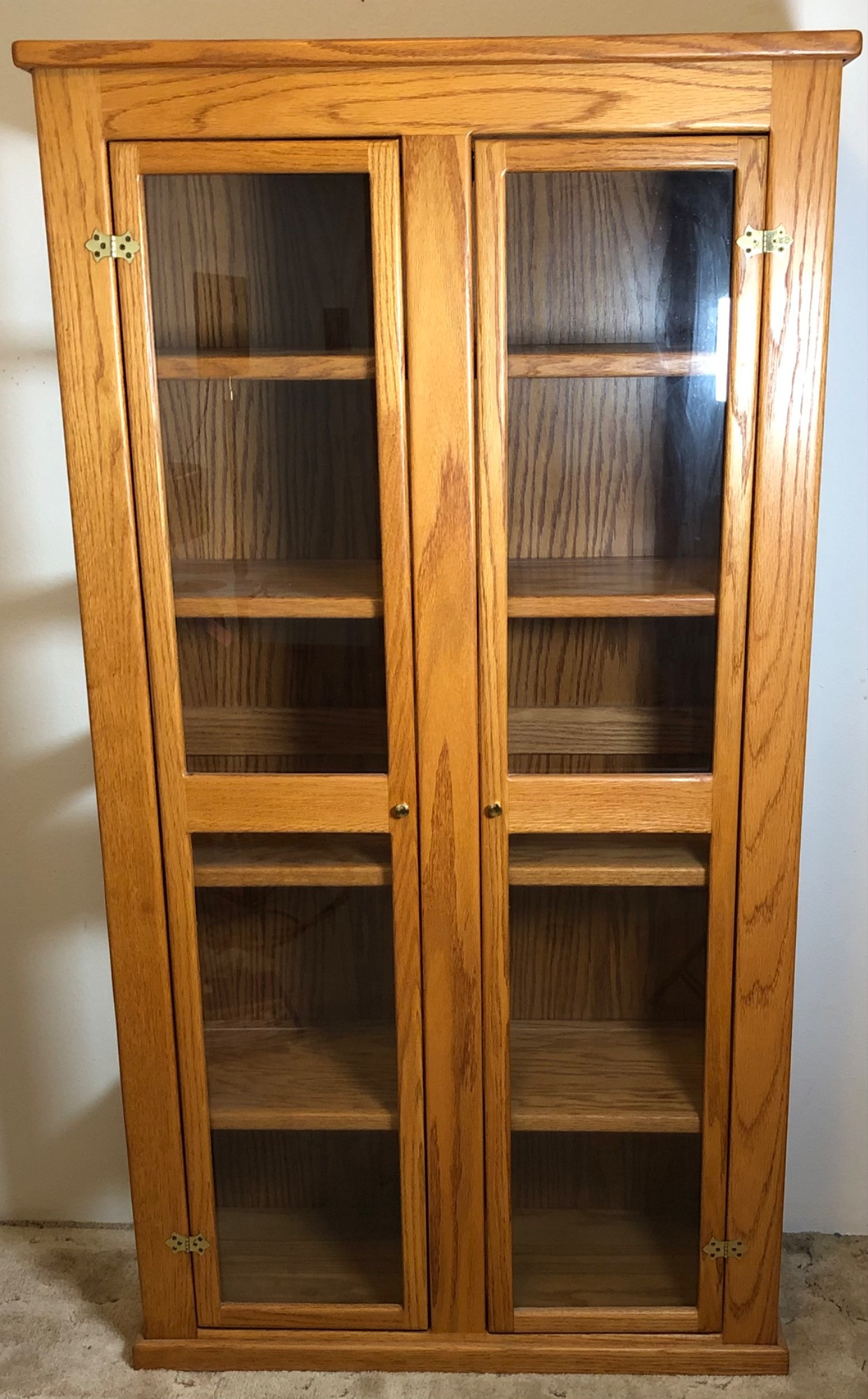 Wood Curio Cabinet Cabinet has 4 adjustable shelves Dimensions: 60.5 Inches High by 32.5 Inches Wide by 11.5 Inches Deep Bidding on this lot is an agreement that: (1.) You