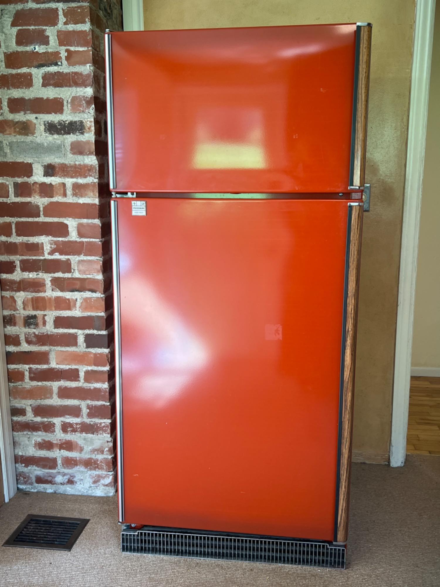 Model FPCI-170T-7 vintage Frigidaire freezer and refrigerator combination with both fully operational. No cracks in smoky grey plastic bins or covers, Retro Poppy red acrylic enamel finish. Refrigerator dimensions: 65.5” tall x 29.5” wide x 25” deep plus 3” clearance at back for coils. Total 28” deep. Located on first floor with steps and/or hillside to maneuver in removal process. Highly recommend 3 to 4 able bodies to safely move item.