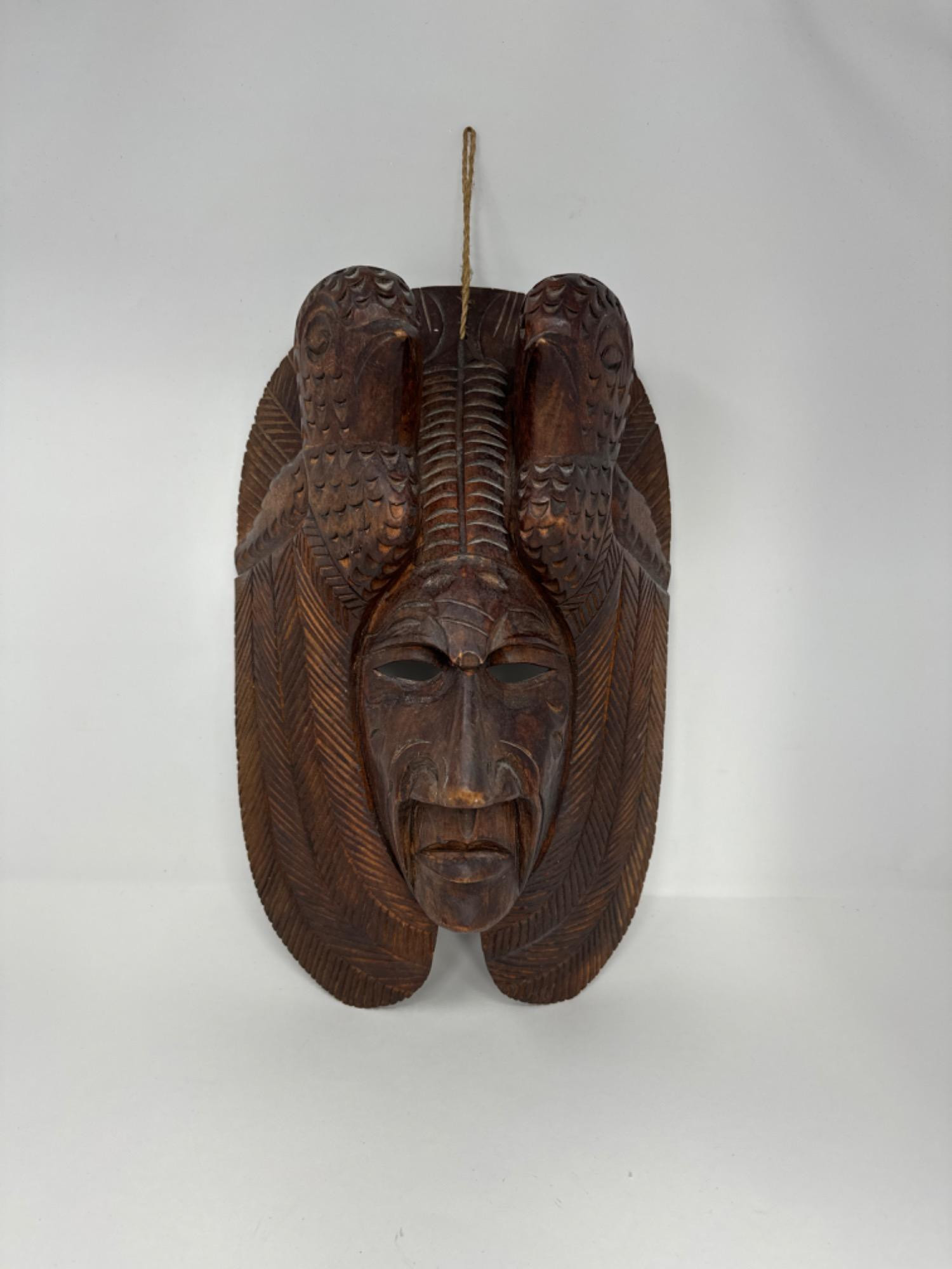 Hand Carved Wood Inca Maya Aztec Warrior Mask Two Birds in very good condition. The two birds on this mask are a rich mythical history to investigate. Mask measures at L 15.5” x W 10”