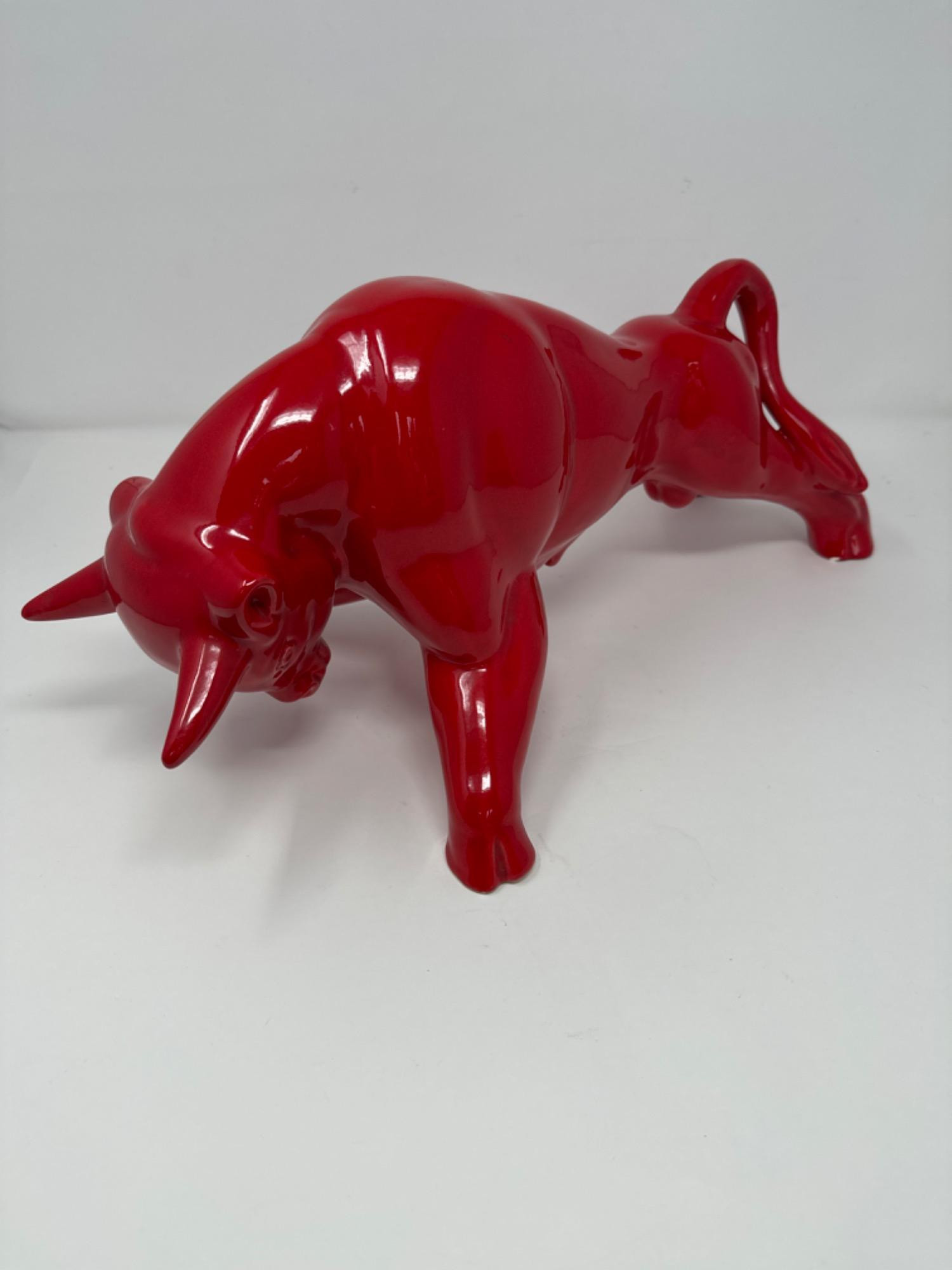 Mid Century Red Royal Haeger Ceramic Bull in great condition. The Red Bull was believed to have been designed by Eric Olsen, the chief designer at Haeger in the 1950's. The Red Bull is one of Eric Olsen's most well-known designs. L 18.5” x 10” W (across chest hoof to hoof)