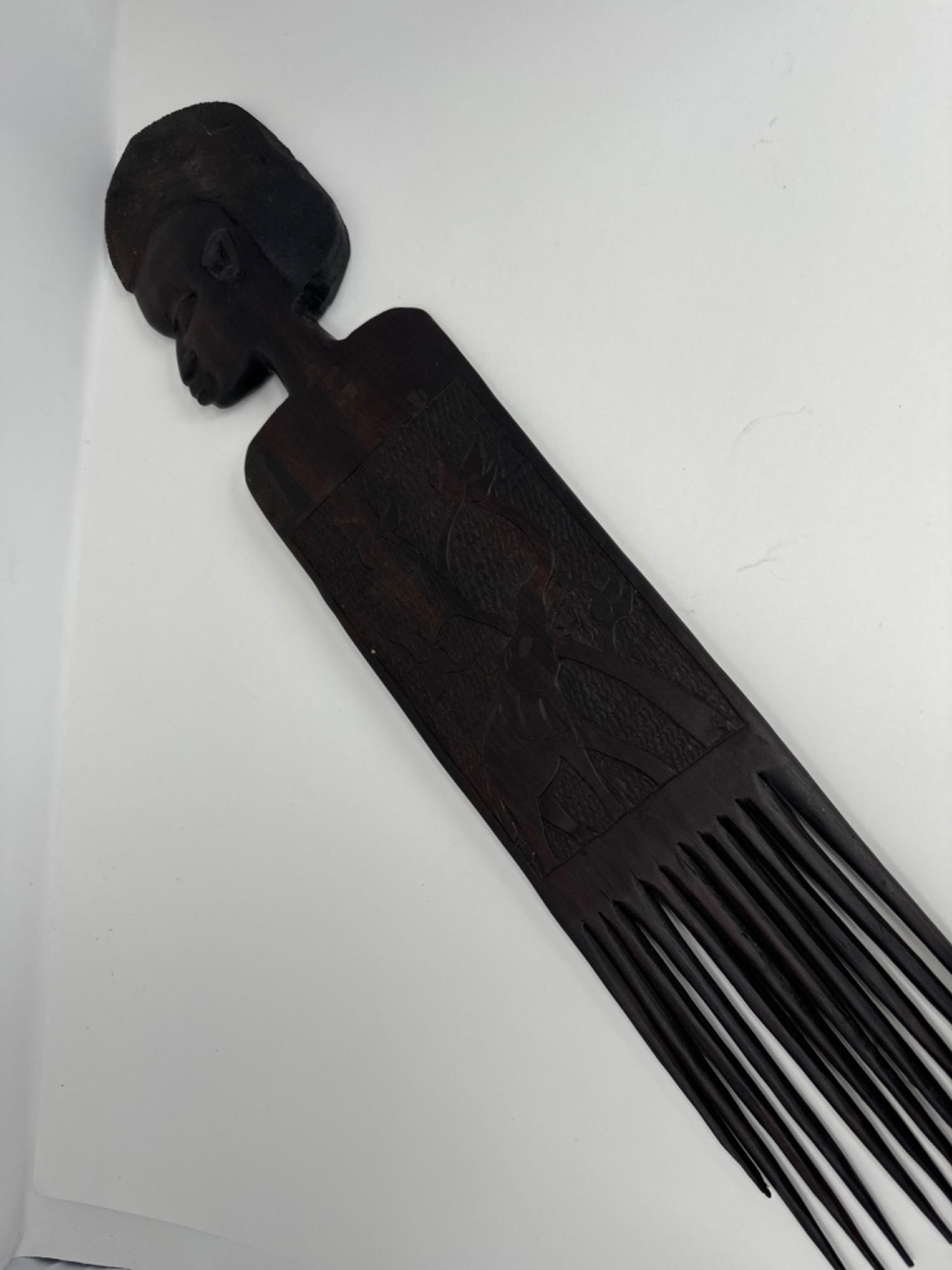 Ebony African hand carved hair comb. Tines are in great condition. The Indigenous African woman on this comb is in wonderful condition and historically, these combs were believed to symbolize a person's status, belonging to a group or their religion. The Fitzwilliam Museum Hair comb measures at L 26.25” x W 5” (at chest)