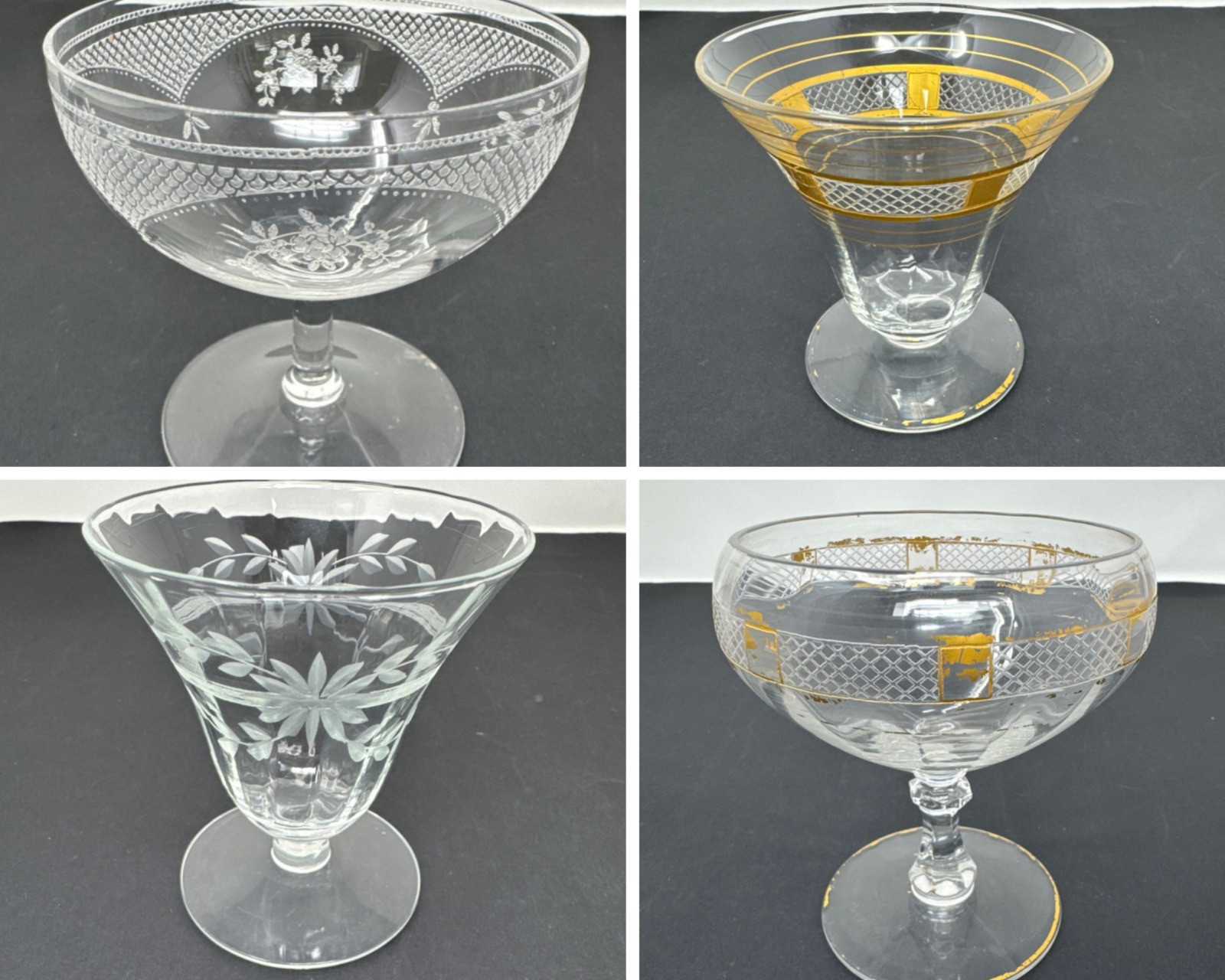 Fostoria Virginia Clear Dessert Cup in excellent condition for any Fostoria glass collector. Fostoria began in Fostoria, Ohio in 1887. Fostoria was known for elegant, pressed, hand-molded and blown glass. Fostoria pieces have also been listed on some Depression glass lists. To read more click here: Fostoria Wikipedia link Etched Art Deco cocktail/ Champagne (?) glass with some worn gold accents and additional matching cocktail glass in good condition would be great additions to a vintage display at home or in a store. Etched Floral Art Deco cocktail glass would complement a center piece or collection of vintage glassware. Fostoria Virginia clear dessert cup measures at H 3.5” x 3.25" diameter Vintage champagne (?) glass measures at H 4” x 3.5” diameter. Vintage cocktail glass measures at H 3.5” x 3.25” diameter. Etched floral cocktail glass measures at H 3.5” x 3.25” diameter.